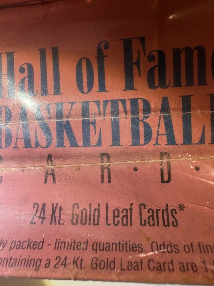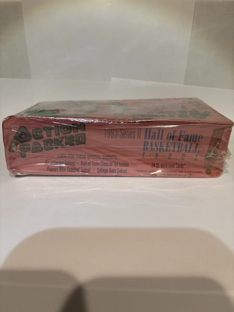 Up for sale is a 1993 Action Packed Basketball Hall of Fame Series II factory sealed box containing 24 unopened packs (6 cards per pack). This box is still sealed in its original factory shrink wrap, as it left the distributor. The shrink wrap is intact with no tears through the seal, confirming it has never been opened or searched. According to the box, this series includes the chance to pull randomly inserted 24-karat gold leaf basketball cards, along with Hall of Fame players and special themed subsets. These gold leaf cards were produced in limited quantities and are one of the highlights of the product. Condition notes (important): • Original factory shrink wrap remains on the box • Visible shelf wear and age-related wear to the box and wrap • No water damage, no crushing, no major holes through the seal This is a true vintage sealed product from the early 1990s, making unopened boxes increasingly hard to find. The sealed packs inside remain untouched. Please review all photos carefully, as they are part of the description. Item is guaranteed factory sealed and will be packed securely for shipping. A great piece for collectors, nostalgia buyers, or anyone looking to open vintage packs with a chance at NBA gold leaf inserts.