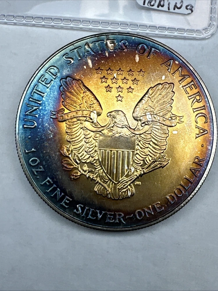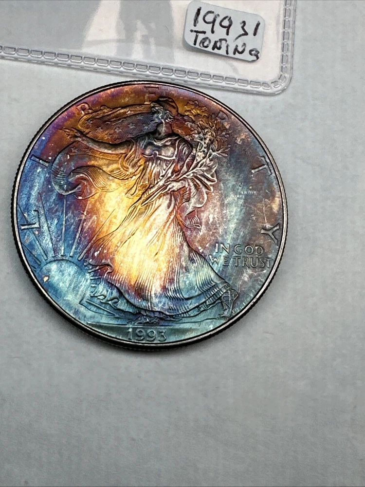This is a 1993 American Silver Eagle coin minted by the U.S. Mint. It contains 1 oz of .999 fine silver with cool rainbow toning. The coin is uncirculated and comes in ungraded condition. It features the iconic American Eagle design and is a popular choice among bullion collectors and investors. Cool Rainbow Monster Toning.