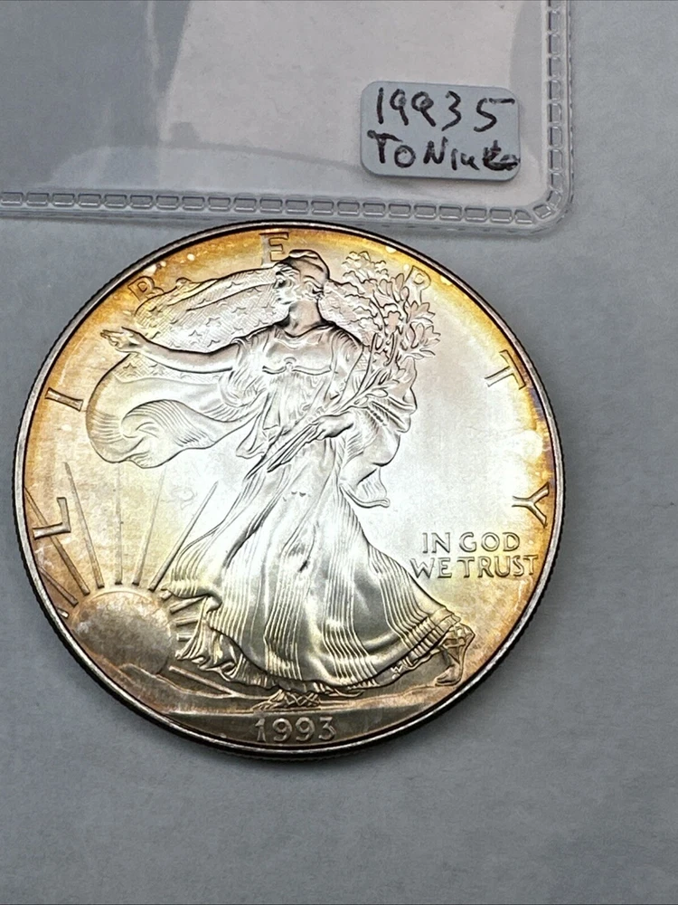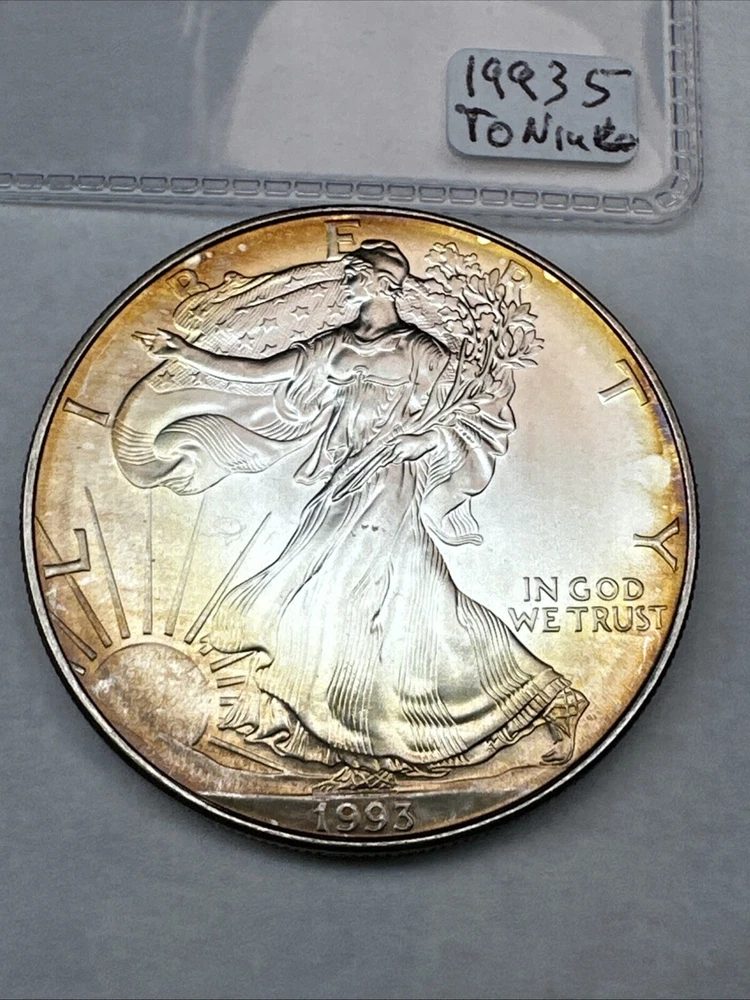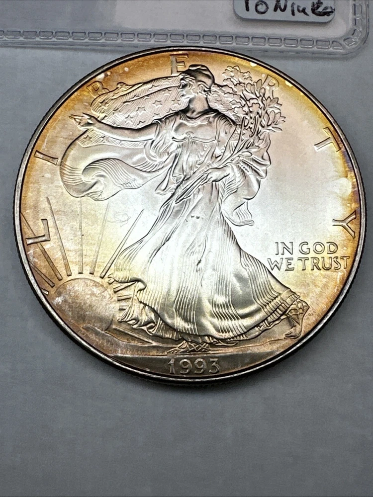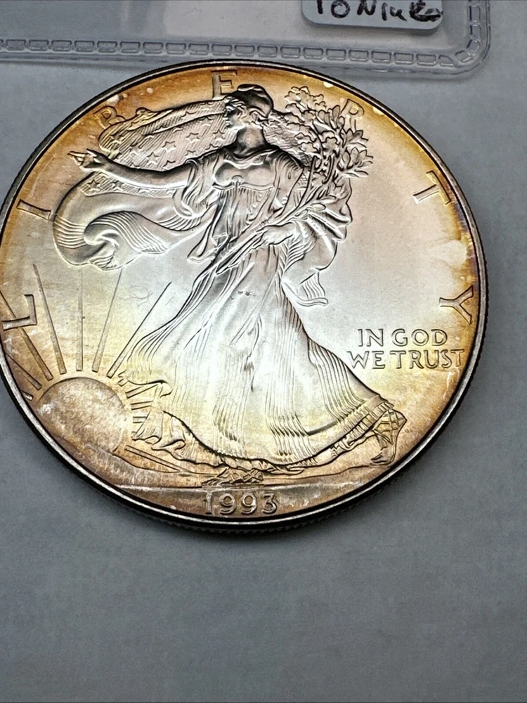 This is a 1993 American Silver Eagle coin, minted by the U.S. Mint. It contains 1 oz of 0.999 fine silver with cool toning. The coin features a depiction of Lady Liberty on the obverse and a heraldic eagle on the reverse. It is uncertified and has a total precious metal content of 1 oz.