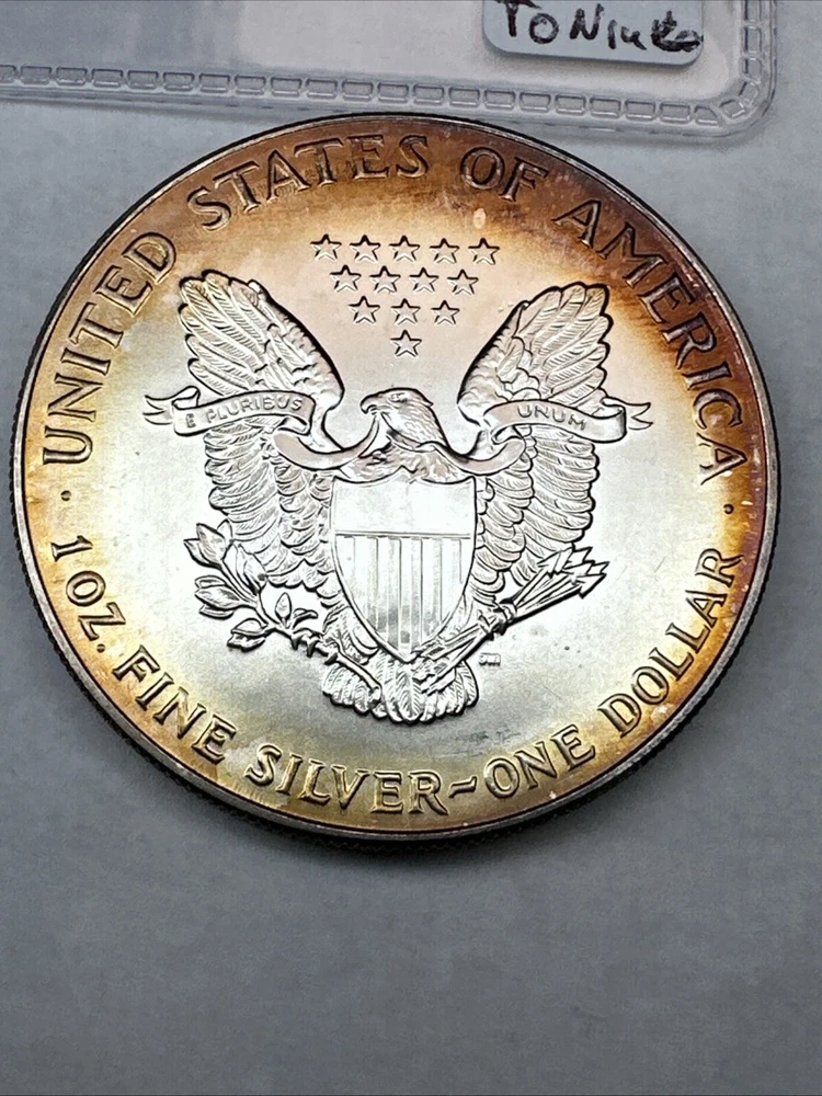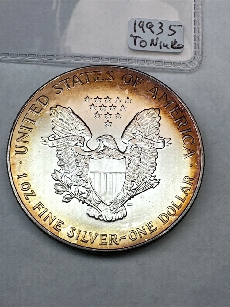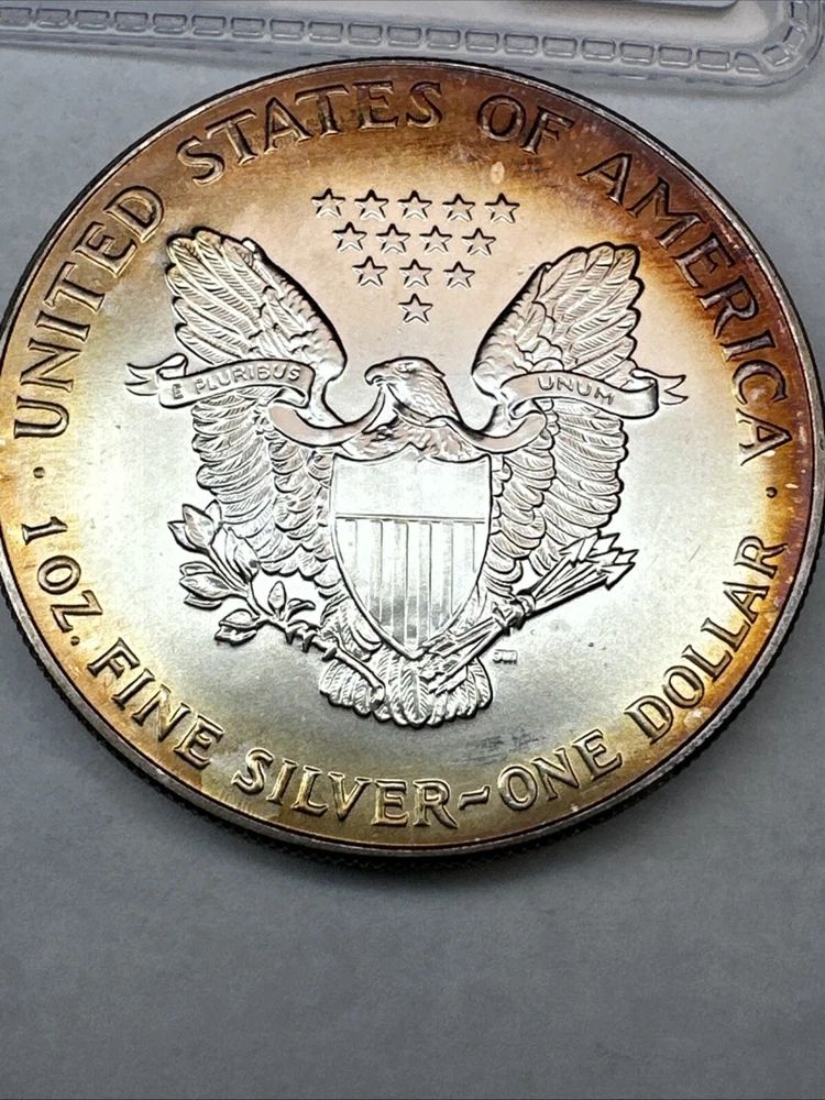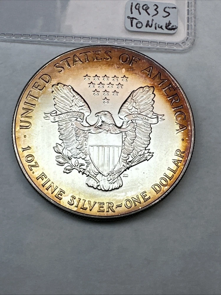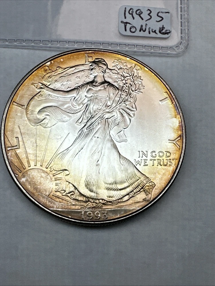 This is a 1993 American Silver Eagle coin, minted by the U.S. Mint. It contains 1 oz of 0.999 fine silver with cool toning. The coin features a depiction of Lady Liberty on the obverse and a heraldic eagle on the reverse. It is uncertified and has a total precious metal content of 1 oz.