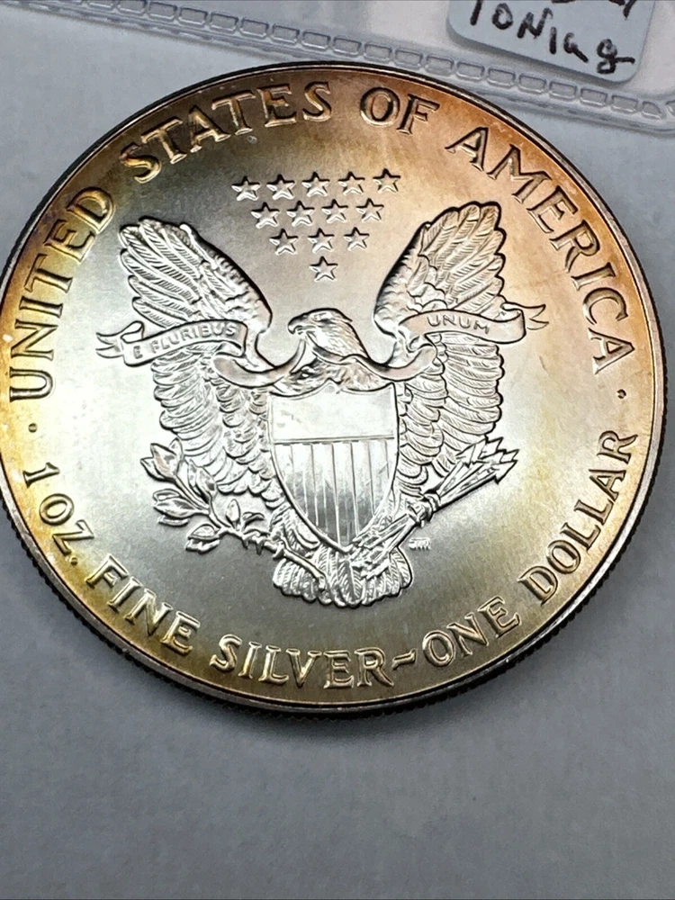 This is a 1993 American Silver Eagle coin, minted by the U.S. Mint. It contains 1 oz of 0.999 fine silver with cool toning. The coin features a depiction of Lady Liberty on the obverse and a heraldic eagle on the reverse. It is uncertified and has a total precious metal content of 1 oz.