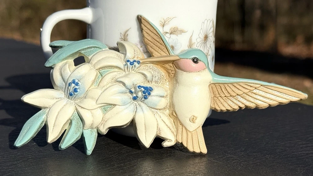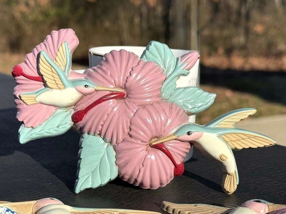 Adorable hummingbird wall decor, this is a set of 3. Made by Burwood in 1993 USA. All three hang on the wall and are light weight. No chips or cracks on any piece. Good used condition. Back has paint wear from production. All have been cleaned for your convenience. Does not come with original box or paperwork. Mug in background is prop only does not come with this lot. Please see all photos before purchasing. Thanks for looking and supporting small business. Measurements: First hummingbird is 6.5” Inches in length and 4” inches in width. Second hummingbird is 5 3/4” inches in length and 3” Inches in width. Third hummingbird is 5” inches in length and 3 3/4” Inches in width.