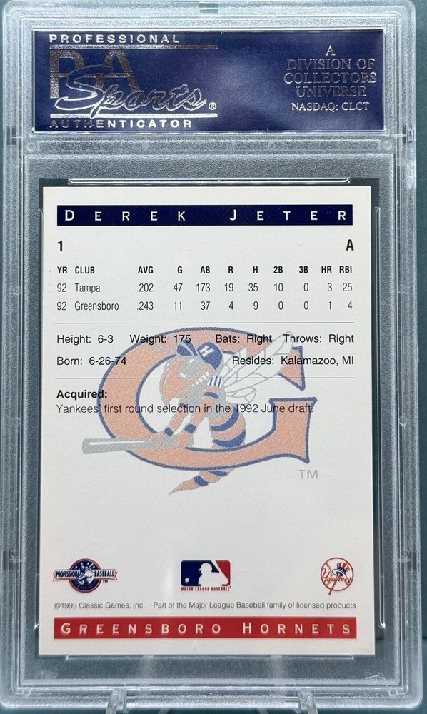 1993 Classic Best Derek Jeter Greensboro Hornets #1 - PSA 10 GEM MINT This rare and iconic card features Derek Jeter during his early days with the Greensboro Hornets, long before he became a New York Yankees legend and first-ballot Hall of Famer. Graded GEM MINT 10 by PSA, this card is in pristine condition, making it a true gem for collectors and Jeter fans alike. As part of the Classic Best series, this card captures a pivotal moment in Jeter’s journey to MLB stardom. Highlights: - PSA 10 GEM MINT grade ensures impeccable condition. - Features a young Derek Jeter with the Greensboro Hornets, showcasing his pre-MLB career. - An essential addition for Yankees fans or any serious baseball card collector. Don’t miss this opportunity to own a piece of baseball history! Whether you’re a collector or investor, this card is sure to be a cornerstone in your collection. Shipping: The card will be carefully packaged and shipped with tracking and insurance to ensure it arrives safely.