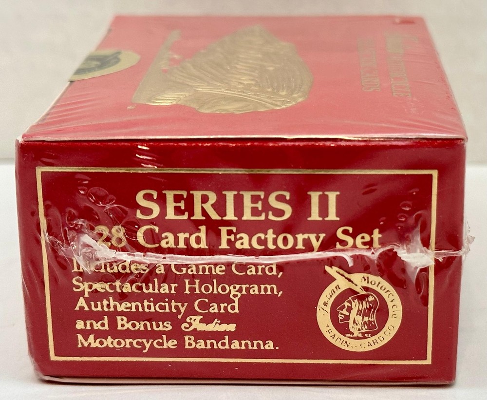 Description: Indian Motorcycle Collector Cards Series Two Factory Card Set Contents: 28 card factory set, includes game card, hologram, authenticity card and bonus Indian Motorcycle bandana. Manufacturer: Indian Motorcycle Trading Card Co, 1993. Condition: New, factory sealed.