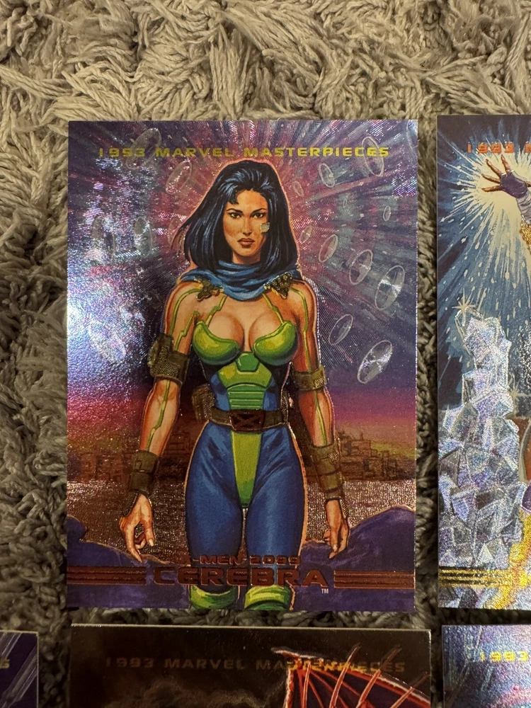 This is a 1993 Marvel Masterpieces NEAR COMPLETE X-MEN 2099 DYNA ETCH INSERT CARD SET, #S1-S8 by SkyBox! Includes an ORIGINAL PACK WRAPPER with purchase! Only missing 1 card! S1 - Meanstreak Set Includes: S2 - Cerebra S3 - Krystalin S4 - Metalhead S5 - Serpentina S6 - Bloodhawk S7 - Skullfire S8 - Xi'an Condition: All cards are Near Mint/Mint. Will ship bubble wrapped for maximum protection to ensure they arrive undamaged and in perfect condition. Please ask with any questions.
