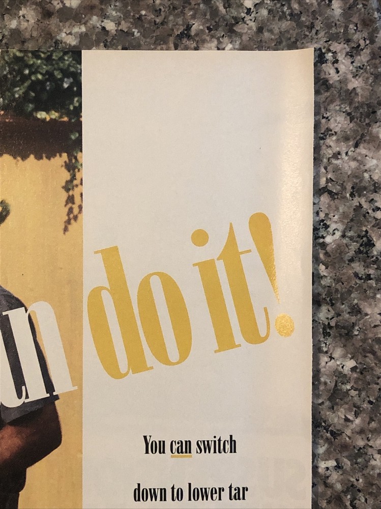 This vintage 1993 Merit Cigarettes print ad features a goofball guy fist pumping the air with the words "You Can Do It!" in bold letters. The ad is a magazine print ad that is perfect for collectors of advertising memorabilia. The ad is in great shape and has been well-preserved over the years. It is a great addition to any collection of vintage advertising items. Get your hands on this unique piece of history today! Original approximate 8”x11” vintage magazine print ad.