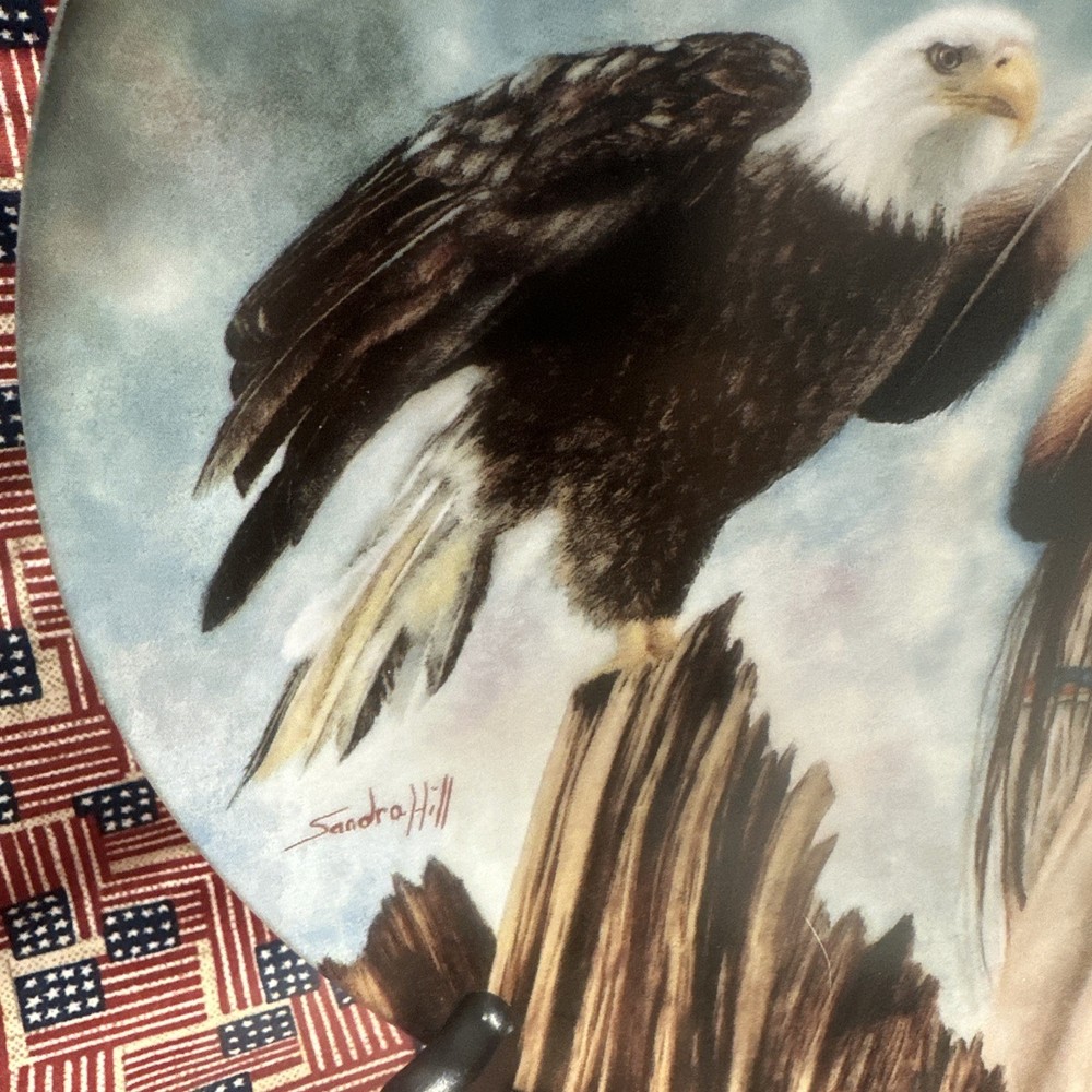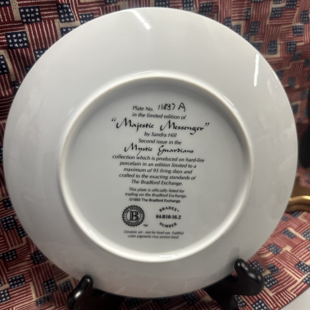 The 1993 Bradford Exchange Mystic Guardians "Majestic Messenger" by Sandra Hill is a collector plate that falls under the category of decorative collectibles. Produced in the art pottery style during the 1990s, this piece reflects Native American culture through its design. As part of the Bradford Exchange brand, this collector plate captures the essence of mysticism and spirituality with its intricate details and symbolism. Perfect for collectors of unique and culturally inspired items, this piece offers a touch of history and artistry to any collection.
