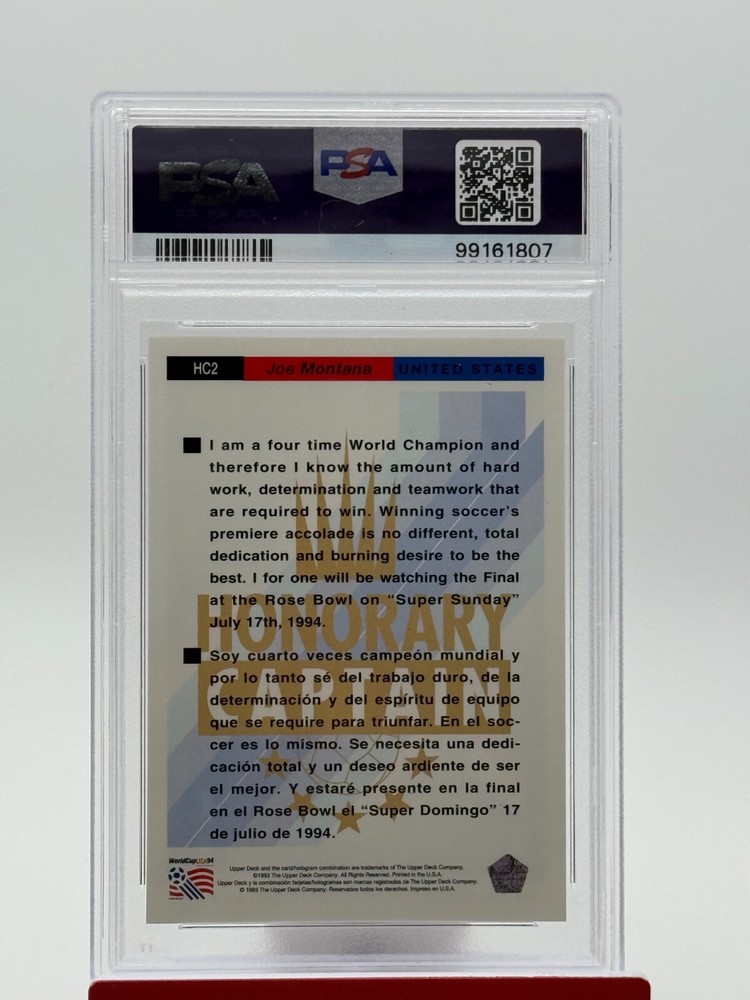 The product is a 1993 Upper Deck World Cup preview trading card featuring Joe Montana as an honorary captain for the Kansas City Chiefs. This insert card, numbered HC2, is part of the 1993 Upper Deck set and is authenticated by PSA as a Gem Mint 10. Montana, a legendary quarterback for the San Francisco 49ers and later the Kansas City Chiefs, is depicted in his honorary captain role, making this card a unique and desirable collectible for fans and collectors of football memorabilia. We will combine Shipping on multiple purchases. Add $0.50 for each additional item up to $4.50 Be sure to check our store for other great deals.