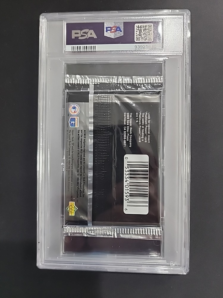You will receive the exact graded pack shown. This pack was graded recently and is sealed from PSA in the holder 93921485 The product is a 1993 Upper Deck SP baseball sealed pack graded PSA 8 by Professional Sports Authenticator. This pack is from the Jeter rookie card year and contains sports trading cards from the 1993 baseball season. As a sought-after collectible, it holds value for fans and collectors looking to potentially uncover cards of iconic players like Derek Jeter in their original sealed packaging from that specific year.