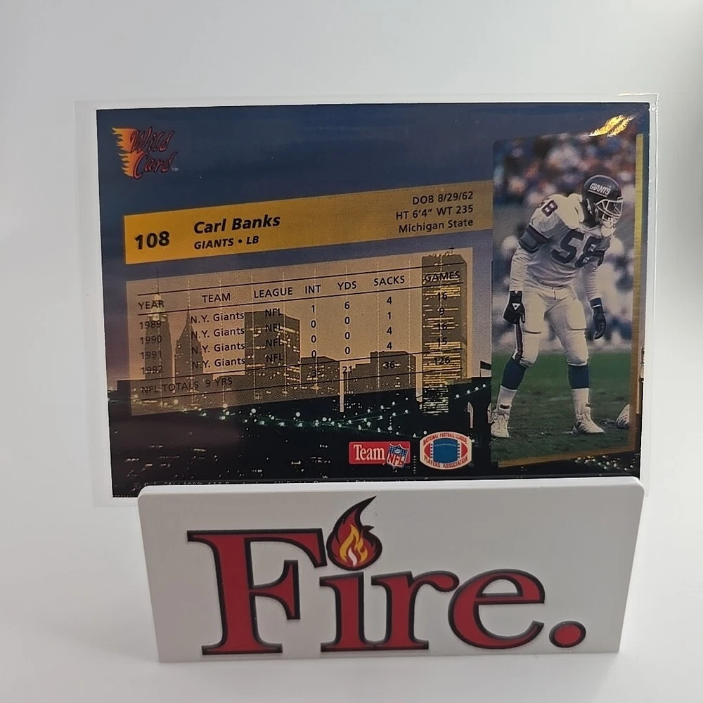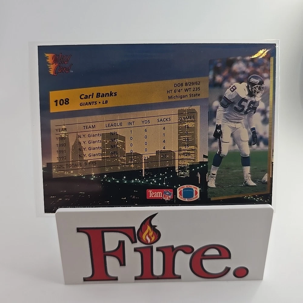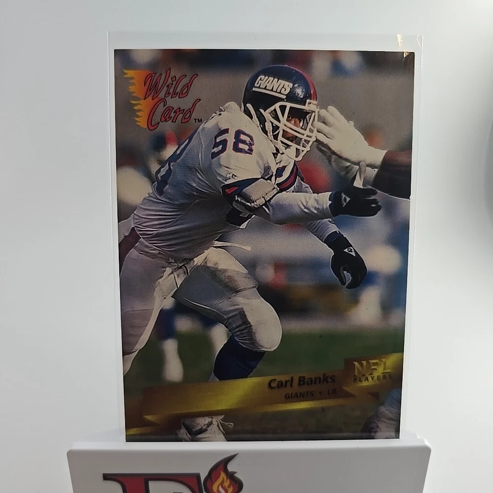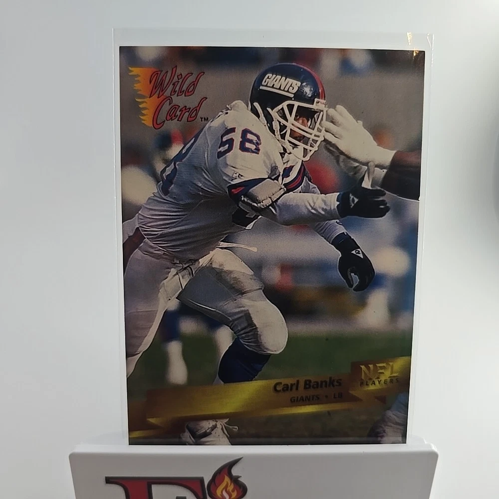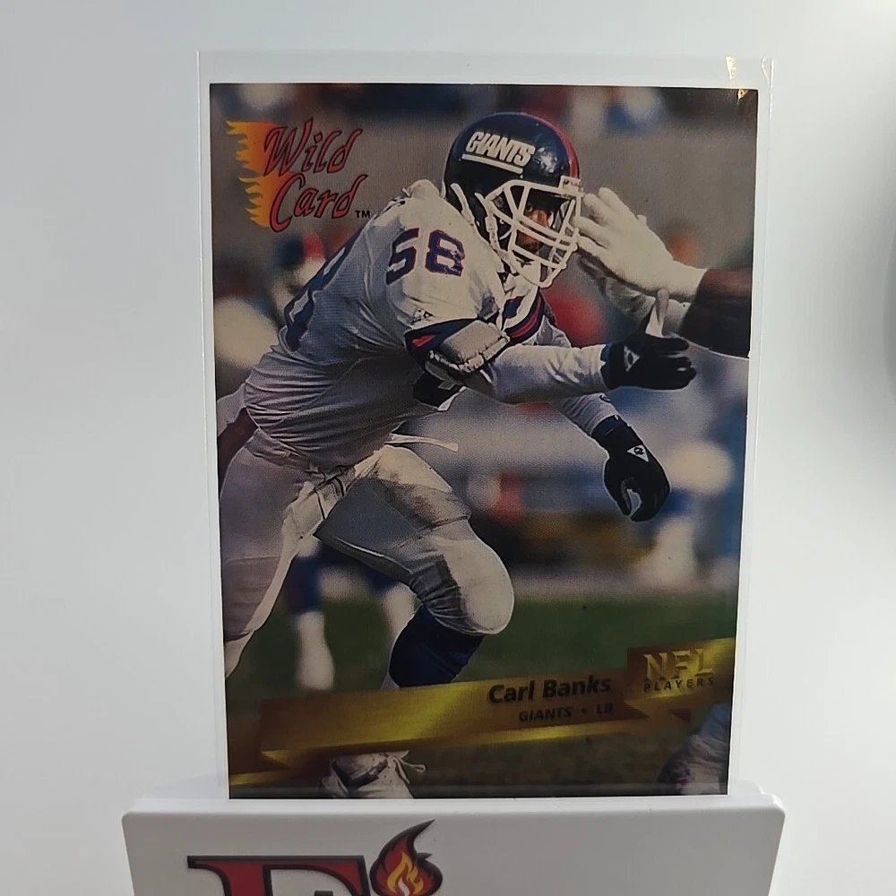 This is a 1993 Wild Card trading card featuring Carl Banks of the New York Giants. The card is part of the base set, with card number 108. It is an original licensed print by AAA Sports Memorabilia, from the National Football League (NFL). The card is standard size and is not autographed. Thank you for your interest, don't let it get away bid today!