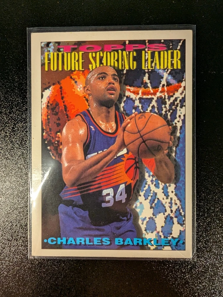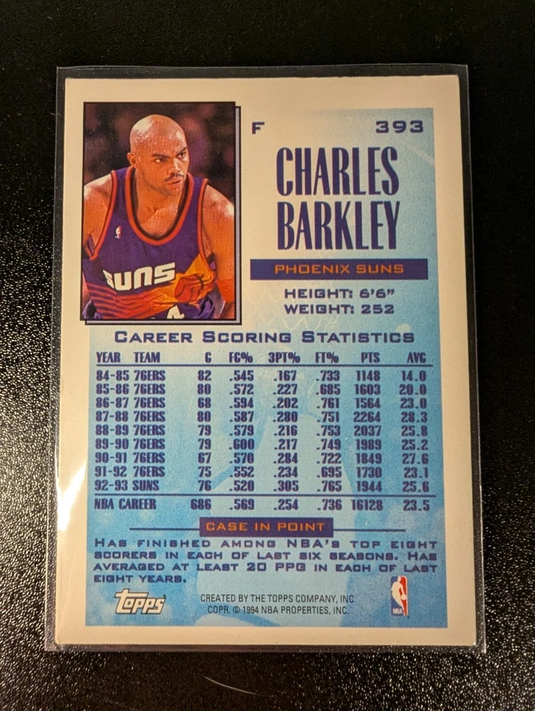 The product is a 1993-94 Topps basketball trading card featuring Charles Barkley from the Phoenix Suns. This specific card is part of the subset highlighting Barkley as a Scoring Leader during that season in the National Basketball Association (NBA). The card number is 393 and it is in excellent condition, part of the base set manufactured by Topps for collectors and fans of basketball memorabilia.