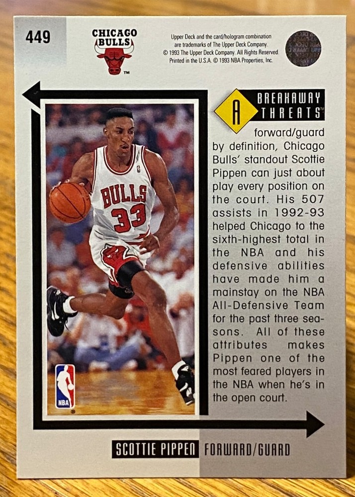 The product is a 1993-94 Upper Deck Scottie Pippen basketball card featuring the player in his Chicago Bulls uniform. This card is an original piece of authentic memorabilia from Upper Deck, part of the 1993 basketball trading card set. The card number is 449 and it is in standard size, with no autograph present. It is a collectible item for fans of basketball and Scottie Pippen, offering a piece of sports history from the 1993-94 NBA season.