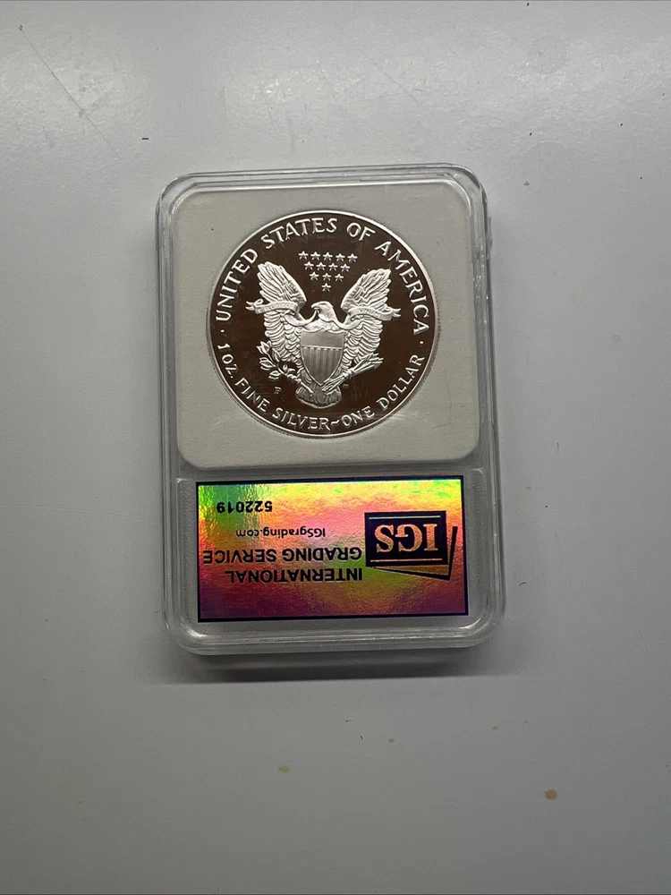 The product is a 1993-P American Silver Eagle $1 Gem Proof coin minted by the U.S. Mint in Philadelphia. It contains 1 oz of 0.999 silver and is of ungraded certification. The coin features a striking Proof strike type with a deep cameo (DCAM) finish, making it highly collectible. The design depicts the iconic American Eagle. This coin easily sells for hundreds of dollars.