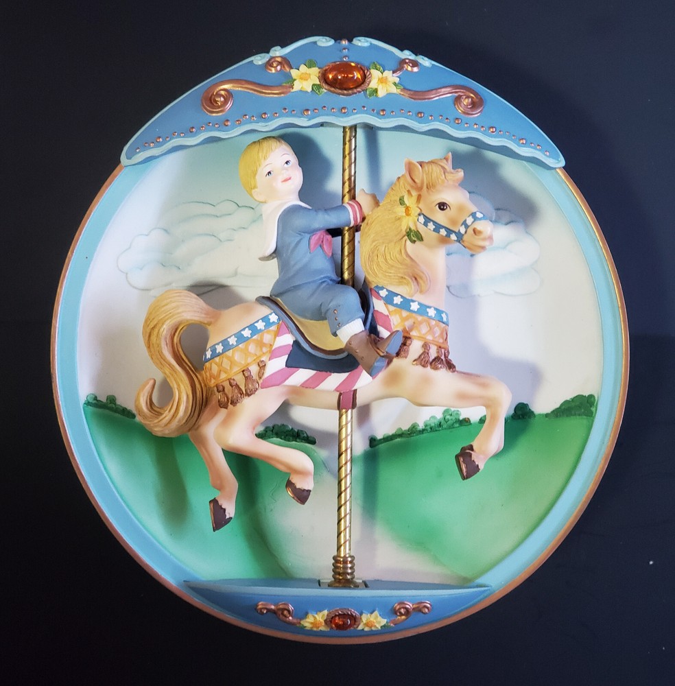 Immerse yourself in the enchanting world of horsemanship with the Bradford Exchange Carousel Daydreams “All Aboard!” Musical Wall Plate. This exquisite collector's piece, dating back to 1994, is a testament to the timeless beauty of equestrian artistry. With plate number A3687, it's a distinctive addition to any collection, designed to be a standout display that captures the essence of motion and music. Crafted by the renowned Bradford Exchange, this wall plate isn't just a visual delight; it's a functional musical treasure that brings a touch of nostalgia and grace to your home. The intricate design and attention to detail reflect the quality and artistry expected from such a prestigious brand, making it a treasure not just for collectors, but for anyone who appreciates the blend of equine elegance and melodious charm.