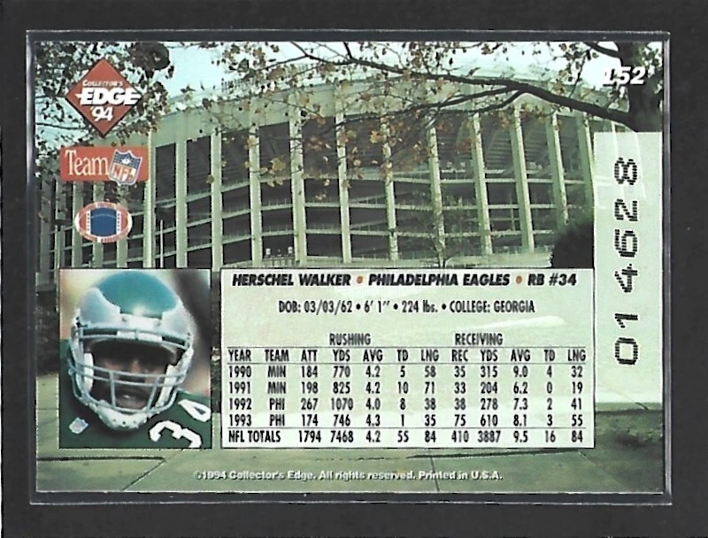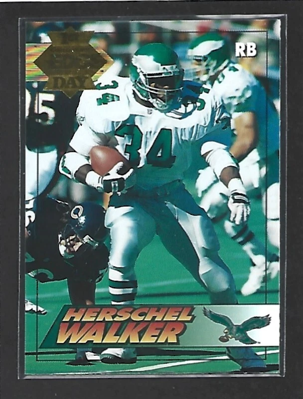Features:Parallel/Variety, Base SetPlayer/Athlete:Herschel WalkerLeague:National Football League (NFL)Team:Philadelphia EaglesParallel/Variety:1st Day GoldCard Number:152Set:1994 Collector's Edgebrand:Collector's EdgeSeason:1994Series:Collector's EdgeManufacturer:Collector's EdgeSport:Football