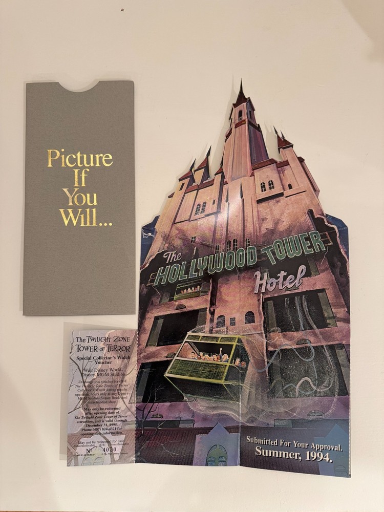 Rare limited edition Disney watch created for the Grand Opening of The Twilight Zone Tower of Terror at Disney-MGM Studios in July 1994 . This commemorative piece was part of the attraction’s opening merchandise and includes the original unused redemption voucher , watch sleeve, and the watch itself. 🕰️ What’s Included: Tower of Terror limited edition watch (1994) Original watch sleeve Unused voucher to redeem the watch 📦 Condition: Watch is unused and never worn Will require a new battery Packaging and voucher show light age but are well preserved (see photos) This is an exceptional find for Disneyana collectors, Tower of Terror fans, and vintage park memorabilia enthusiasts—especially with the unused voucher, which is rarely still included. A true piece of early Disney-MGM Studios history.