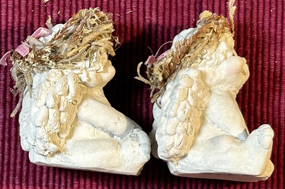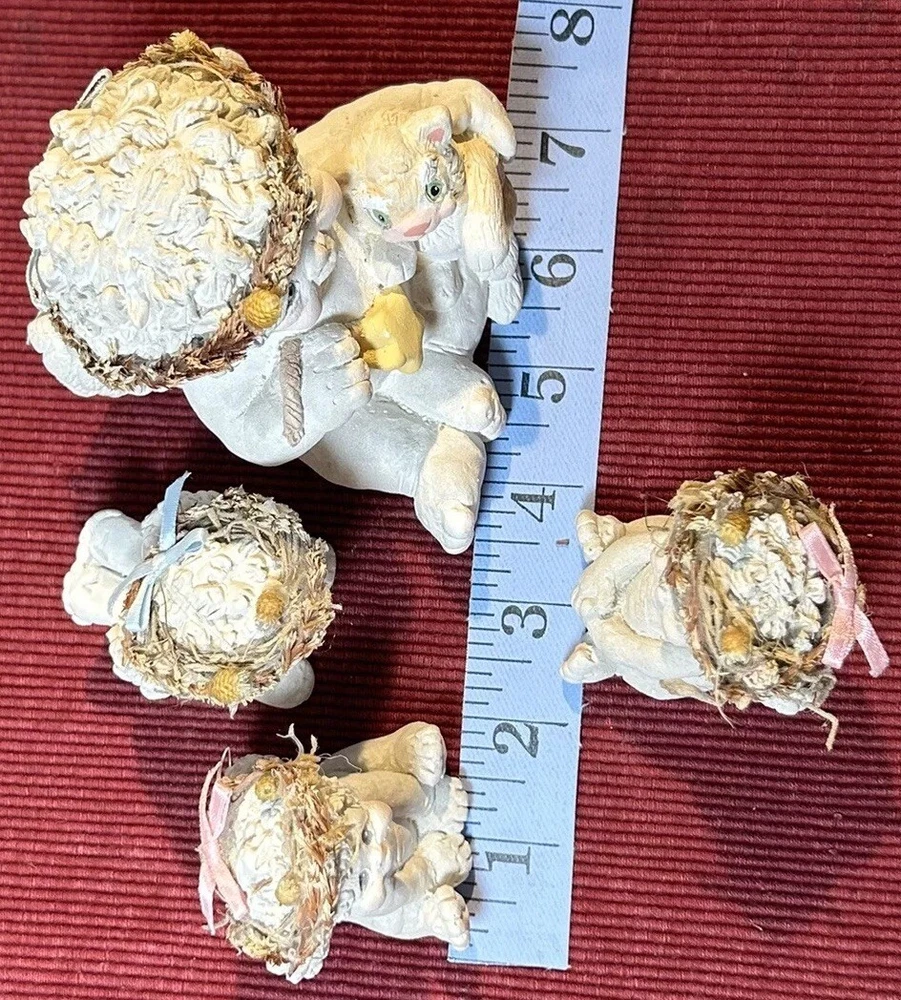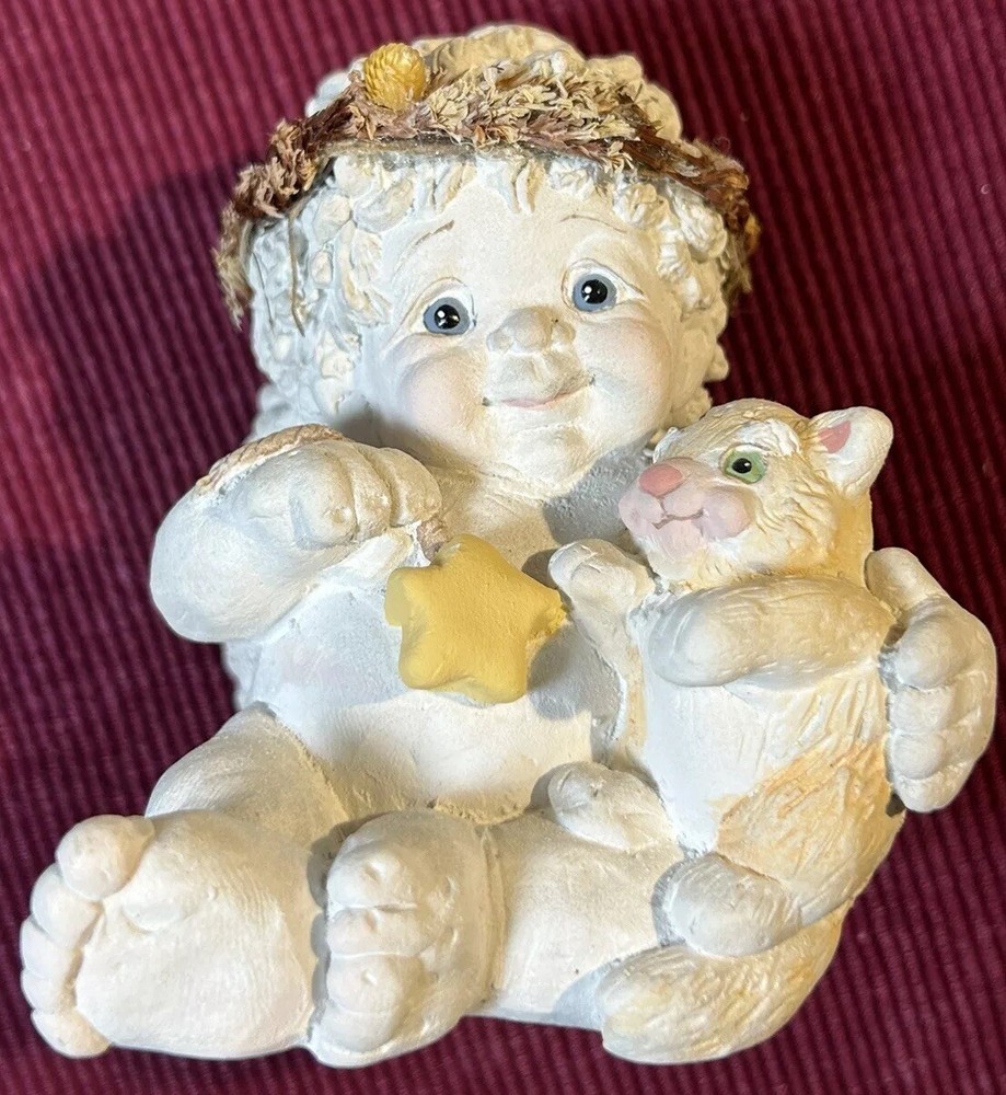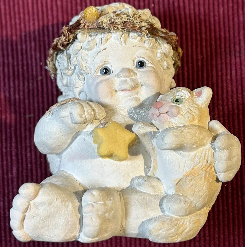 Dreamsicles “Love My Kitty” and 3 Little Sitting Cherubs Cast Art Figurines by Kristin. This is a bundle of 4 angel Dreamsicles. They are from 1991 and 1994, made by Cast Art. Each of the 3 little angels is stamped “Kristin” on the bottom. The larger figurine has “Kristin” actually hand scored into the clay. They are super cute and in good condition. Please see photos for details. Measurements are approximate. Smoke free home. I use recycled materials in shipping whenever possible and advisable. Please let me know if you have any questions.