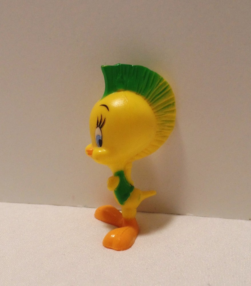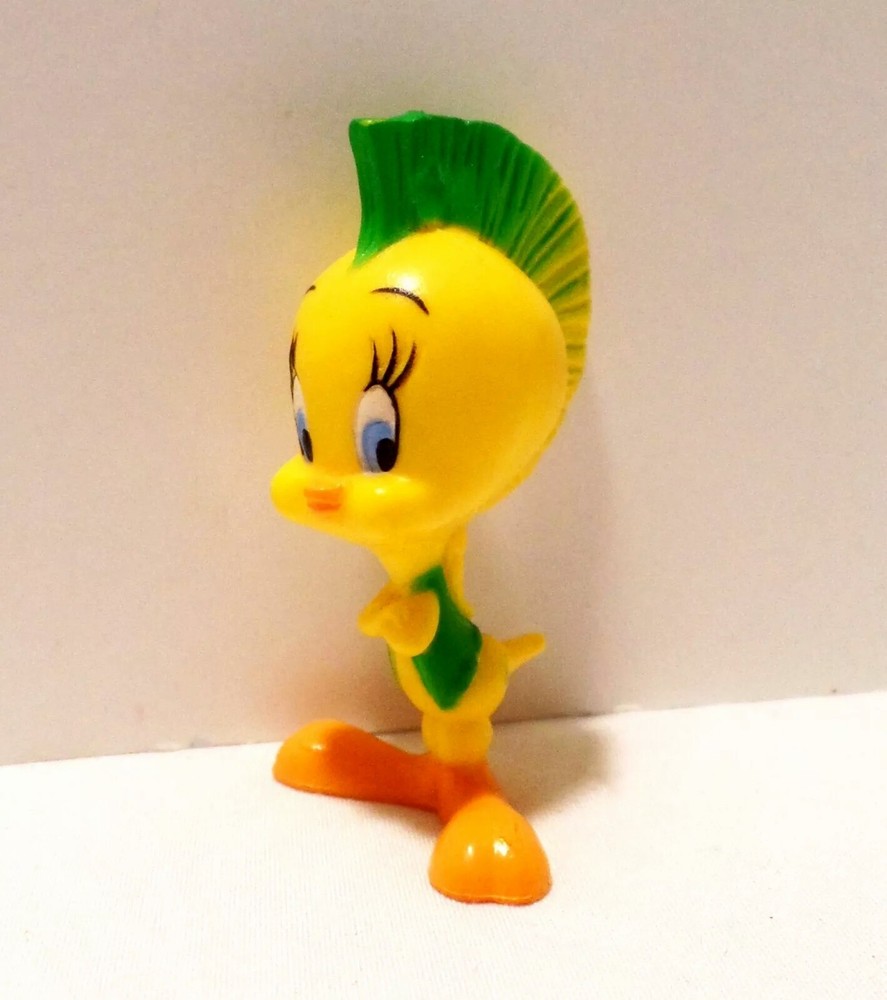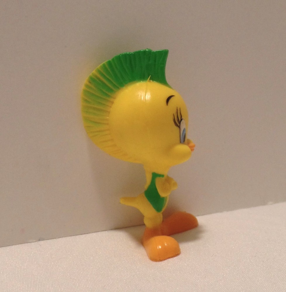 This vintage PVC figure features Tweety Bird in a punk rock outfit with a colorful mohawk. The item was manufactured in Macao in 1994 and is officially licensed by Looney Tunes. This collectible item is perfect for fans of the classic cartoon series and would make a great addition to any animation merchandise collection. 2.25" Pre-owned