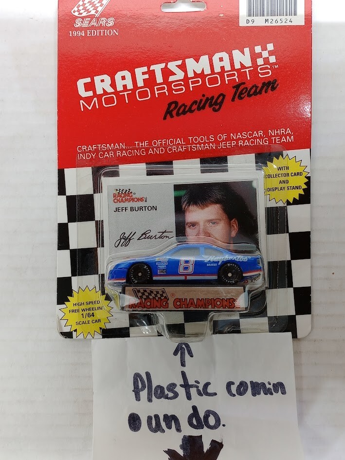 1994 Nascar Racing Champions #8 Raybestos Jeff Burton Diecast Car On Card SKU#102775 Blister coming up from the card Look closely at the pictures to see further details. PLEASE see photos for detailed condition!! PLEASE LOOK AT THE PHOTOS CAREFULLY BEFORE PURCHASING!! If you are purchasing more than one item from us and would like combined shipping, PLEASE request an adjusted invoice from us while still in the cart and BEFORE paying. eBay does not usually calculate combined shipping accurately and you might get overcharged. Please be aware that when we photograph items, we use lighting that will show the details well. Although we try to present the product as accurately as possible, the lighting may affect the overall look of the item by appearing lighter/darker or possibly a different hue than the actual item. Depending on the type of lighting you have in your home, there may be some differences between the photos and the actual item. If this is a concern of yours, please feel free to request additional photos made in natural lighting or ask for a more detailed description of the item PRIOR TO PURCHASE! PLEASE NOTE: We greatly appreciate your interest in our item for sale. We look forward to a pleasant, quick and satisfying transaction for everybody, so please note the following information before bidding. Thank you! ITEM DESCRIPTIONS: * We will try to describe items well and provide plenty of photos. Please review these carefully before bidding or purchasing. * Only the items pictured and described are what you will receive when purchased. * We will occasionally offer an item clearly marked "AS-IS". This means that we are not sure if it works because we are unable to test it for whatever reason. We will offer these at a discounted price then a similar "working" item. It is possible that these items will work fine, but it also is possible that these items are more useful for their parts. Please only bid on or purchase these items if you are well aware of this, as we will only provide refunds of actual item price (no shipping cost refunds) for these items. * If you have any questions that aren't addressed by the descriptions or photos, please feel free to ask before you bid. * There may be bends, dents or parts of the blister that have minor issues due to long term storage Or plastic that is failing apart, paint wear, marks from items own packaging. Such things will be pointed out under the description, please look closely at the pictures for further details. PLEASE LOOK AT THE PHOTOS CAREFULLY BEFORE PURCHASING!!