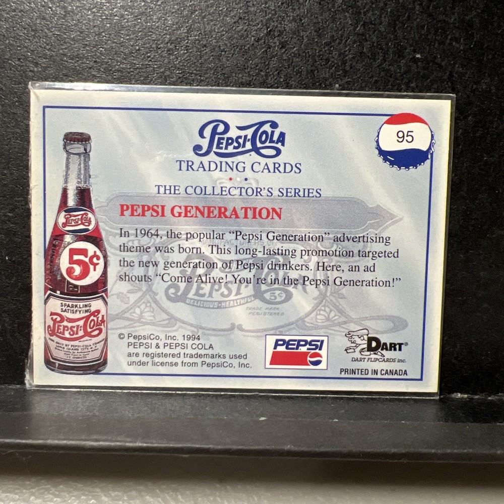The 1994 Pepsi Cola 'Come Alive!' Dart Flipcards #95 are vintage non-sport trading cards made of card stock. These original cards from the Pepsi Cola franchise feature a blue parallel variety and are part of Series 1. Manufactured by Dart Flipcards in Canada these standard-sized cards are a promotional item showcasing the iconic 'Come Alive! You're in the Pepsi Generation!' slogan. A valuable addition to any trading card collection, these cards capture the nostalgia and excitement of the 1990s Pepsi Cola era. (PWE#2763)