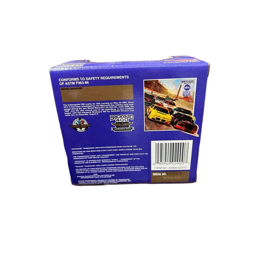 Material: Diecast Vehicle Make: Ford Organization: NASCAR Vehicle Year: 1994 Series: Brickyard 400 Brand: Racing Champions Color: Multi-Color Country/Region of Manufacture: China UPC: 95949029007 Racing Team: Roush Racing Vehicle Type: NASCAR Racecar Scale: 1:64 gtin13: 95949029007 Driver: Mark Martin Race series: Daytona Model: Brickyard 400 1 / 64