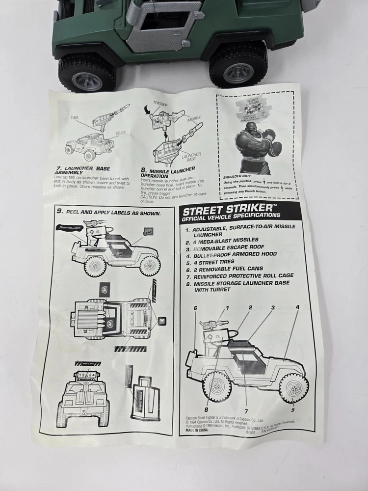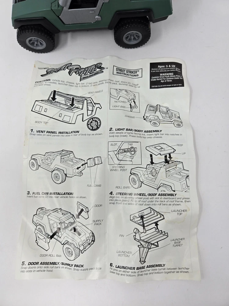 This vintage 1994 Street Fighter movie GI Joe action figure vehicle represents Striker, the jeep from the G.I. Joe A Real American Hero TV show. The Jeep vehicle in a 1:18 scale, featuring a multicolor design with plastic material. It is part of the G.I. Joe franchise by Hasbro and includes everything shown, such as the instruction sheet. This collectible piece offers a nostalgic feel as a vintage item from the 1990s, making it a sought-after addition for fans of military and adventure-themed toys. INCOMPLETE, but in Very Good condition. Even has the instruction sheet. All of our items are shipped from a SMOKE-FREE environment.