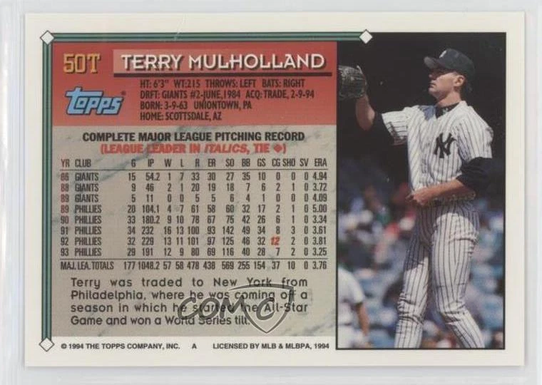 1994 Topps Traded - Box Set [Base] #50T Terry Mulholland - Baseball Card - Featuring the New York Yankees - Featuring Terry Mulholland Search for more: 1994 Topps Traded Search for more: 1994 Topps Traded - Box Set [Base] View all of our Listings Auctions Buy It Now About Us Located in the beautiful Pacific Northwest, COMC (Check Out My Cards) is the world's largest consignment service for trading card singles. More than 10,000 people have used our consignment service to list over 50 million trading cards. We currently house 20 million cards, each listed for sale with front and back images of the actual card. Find out how we can help you consign your items on eBay by contacting us through eBay messaging. COMC -- "The Safe & Easy Way to Buy & Sell" Representative Image - Select Specific Item above to see image of actual item Representative Image - Select Specific Item above to see image of actual item Raw Condition for Modern Cards Unless otherwise noted, raw modern cards are listed in Near Mint-Mint condition or better. A NM-MT card appears to be Mint at first glance, but upon closer inspection, may exhibit some of the following: minor print defects (e.g. roller marks, print line, dimple), minor scratches, slight edge wear, and slight corner wear. Centering is clearly visible in the images provided and does not factor into our condition assessment. Raw Condition for Vintage Cards Unless otherwise noted, raw vintage cards are listed in Excellent condition or better. An EX card may exhibit some of the following: minor rounding of corners, surface wear, print defects, light scratches, and slight edge wear/chipping. Centering is clearly visible in the images provided and does not factor into our condition assessment. Domestic Shipping Combined shipping for multiple items is available. To receive combined shipping, please ensure all desired items are in your eBay shopping cart before proceeding to checkout. eBay limits orders to 40 items per order. We automatically combine multiple orders placed on the same day. If you place multiple orders on the same day, please contact us to request a refund of applicable shipping costs. Signature confirmation may be required on invoices over $400. Raw cards are shipped in toploaders. International Shipping COMC offers eBay's International Shipping (EIS) for international orders under $2,500* (see country exceptions below). All duties and import fees are paid at checkout; in the rare event that there are additional import fees upon delivery, these are borne by the buyer. EIS packages route through a shipping hub in Erlanger, KY before shipping to their final destination. Please note that EIS does not allow for combined shipments. The shipping rates are determined by eBay and cannot be adjusted. *Maximum sale price exceptions: Colombia, Kuwait ($2,000); Taiwan ($1,539); Chile, Costa Rica, Guatemala, Honduras, Trinidad and Tobago ($1,000); Antigua and Barbuda, Aruba, Belize, Dominica, Grenada, Philippines, Saint Kitts and Nevis, Saint Lucia, Montserrat, Turks and Caicos Islands ($500); Dominican Republic, El Salvador ($200). Please request a shipping quote through eBay messaging for orders that exceed the maximum sale price supported by eBay's International Shipping. You will be responsible for all duties and import fees for international orders shipped outside the EIS. Raw cards are shipped in toploaders. Payment COMC does not accept offers on our cards through our eBay storefront. COMC utilizes eBay’s managed payments system. If you are experiencing difficulties making a payment, please contact eBay for assistance. Return Policy Returns are only accepted on the rare occasion the item is not as described. If you are making a return, please initiate the return process through eBay so a mailing label can be provided for you. Prior to listing, our expert team carefully assessed this item to represent it accurately. Please review the description and high-definition images prior to purchasing to ensure this item meets your satisfaction. We welcome you to contact us if you have further questions about this item. Trust and Integrity COMC carefully assesses each item consigned to us to prevent fraudulent items from entering the marketplace. If you believe an item offered on COMC may be fraudulent, please contact us with details so we can investigate the issue. Items we determine are outside our supported items policy may be removed. Last Modified: 1/8/2025 9:21:54 AM PDT