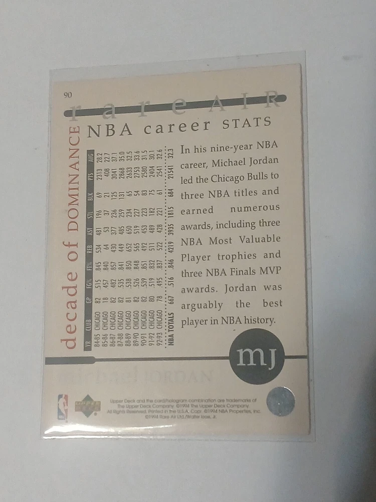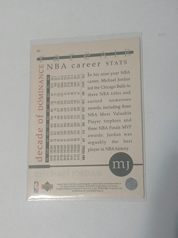 Elevate your sports trading card collection with the iconic 1994 Upper Deck Jordan Rare Air #90 featuring the legendary Michael Jordan. This sought-after card celebrates Jordan's remarkable career with the Chicago Bulls during the 1994 NBA season, capturing the essence of his airborne prowess and undeniable skill on the court. Crafted by Upper Deck, a trusted name in sports memorabilia, this card is part of the distinguished 1994 Upper Deck Jordan Rare Air set, a must-have for enthusiasts and collectors alike. With its vivid imagery and historical significance, this card is a tribute to Michael Jordan's enduring legacy in the sport of basketball.