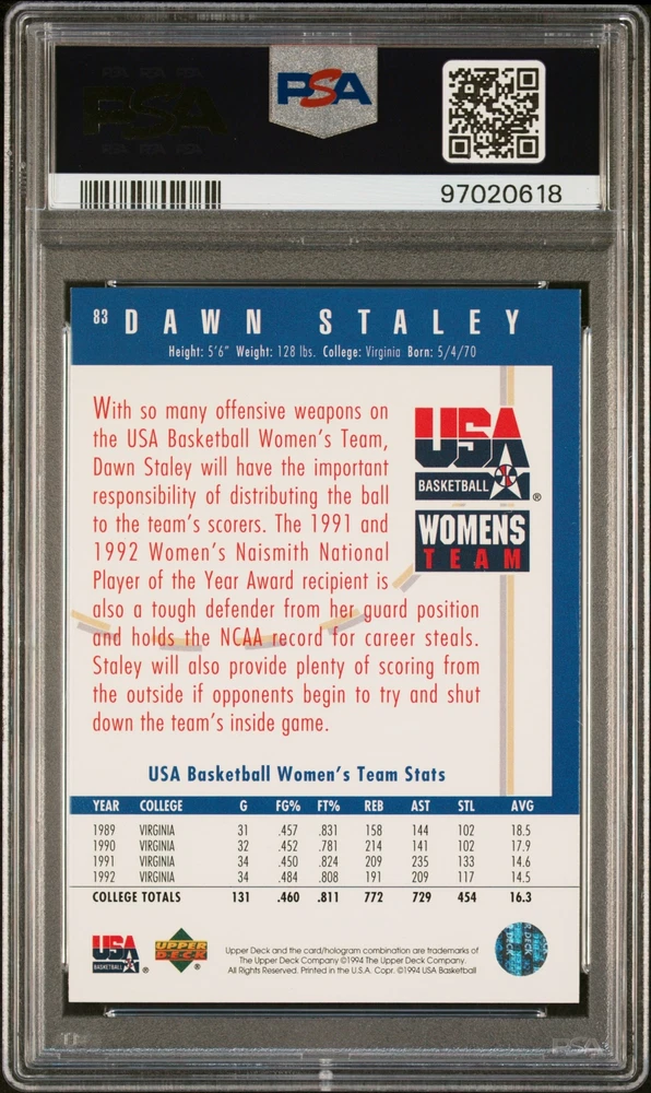 This is a nice example of a 1994 Upper Deck Usa Basketball #83 Dawn Staley Women'S Team Other important information about this card: PSA 9 1 MINT In 1994 Dawn Staley played for the USA. Please check out our other listings for more great cards.