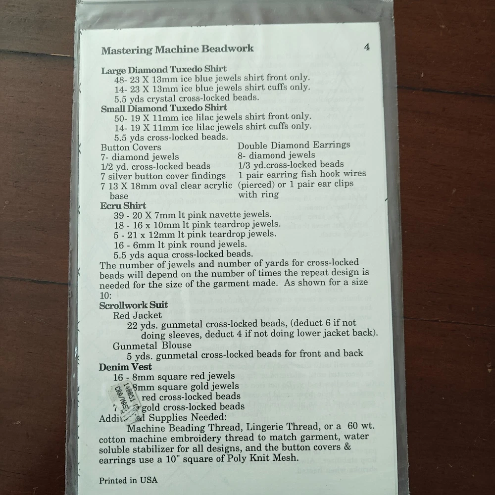 Description: This 1994 vintage "Mastering Machine Beadwork" pattern set by The Crafty Critter offers six full-size patterns and instructions for intricate beadwork and jewelry embellishments. Designs include stunning shirts, jackets, vests, and accessories such as button covers and earrings. Brand: The Crafty Critter Year: 1994 Condition: New old stock (factory-sealed, minor wear on plastic wrap) Designs Included: Large & Small Diamond Tuxedo Shirts, Ecru Shirt, Scrollwork Suit (Red Jacket & Gunmetal Blouse), Denim Vest, Button Covers, and Earrings Materials Needed: Cross-locked beads, jewels, and embroidery thread (not included) This set is ideal for anyone looking to add detailed beadwork to their garments or create unique, vintage-inspired embellishments. Instructions are tailored for crafting with high-quality materials like cross-locked beads and gems. Keywords: vintage crafting patterns, machine beadwork, 1992 The Crafty Critter, Ultra Suede appliquΓ©, sequin embellishment, crafting supplies, vintage sewing patterns