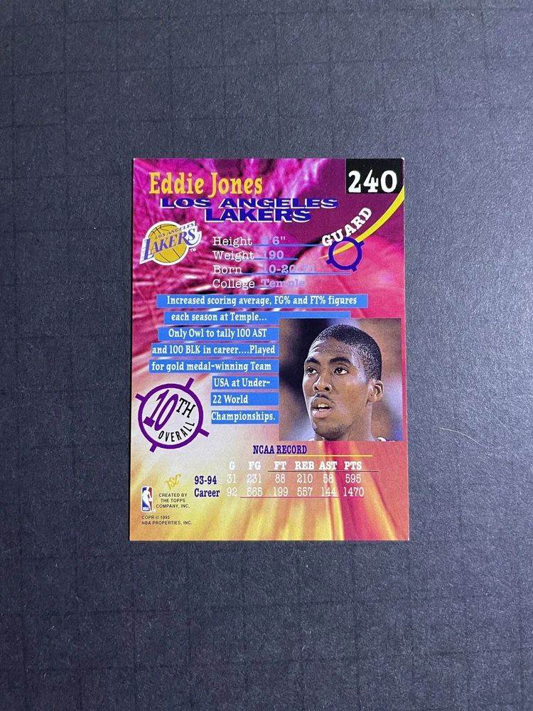 Type: Sports Trading Card Original/Licensed Reprint: Original Language: English Sport: Basketball Card Size: Standard Material: Card Stock Year Manufactured: 1995 Country/Region of Manufacture: United States Manufacturer: Topps Player/Athlete: Eddie Jones Season: 1994-95 League: National Basketball Association (NBA) Card Number: 240 Team: Atlanta Hawks, Boston Celtics, Charlotte Bobcats, Charlotte Hornets, Chicago Bulls, Dallas Mavericks, Golden State Warriors, Indiana Pacers, Los Angeles Clippers, Los Angeles Lakers, Miami Heat, New Jersey Nets, New Orleans Hornets, Orlando Magic, Philadelphia 76ers, Phoenix Suns, Portland Trail Blazers, Seattle Supersonics Features: Base Set, Rookie Set: 1994-95 Topps Stadium Club