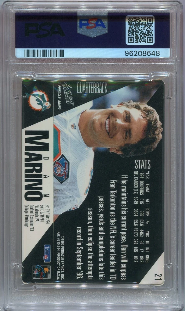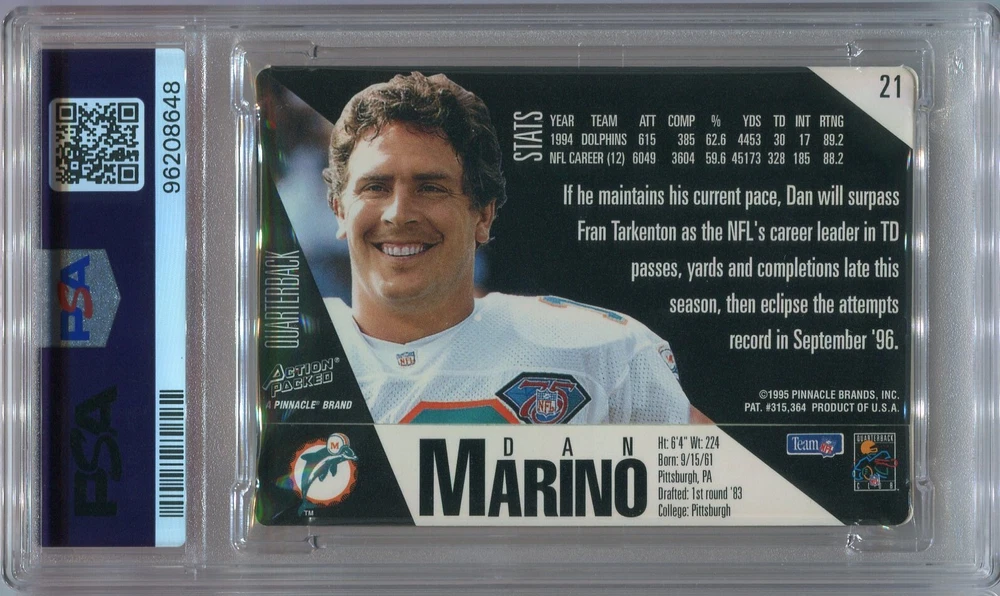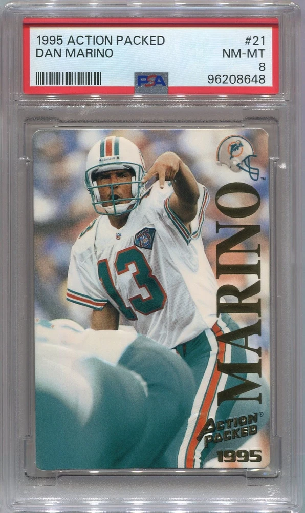 This 1995 Action Packed trading card features Dan Marino, the legendary quarterback for the Miami Dolphins. With a beautiful design and high-quality printing, this card is a must-have for any serious collector. The card is part of the base set and has the card number 21, making it a valuable addition to any collection. The card is in great shape and has been well-preserved, ready to be added to your collection. This card is perfect for fans of the National Football League (NFL) and collectors of sports trading cards. Don't miss this opportunity to add a piece of football history to your collection.