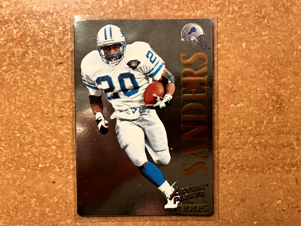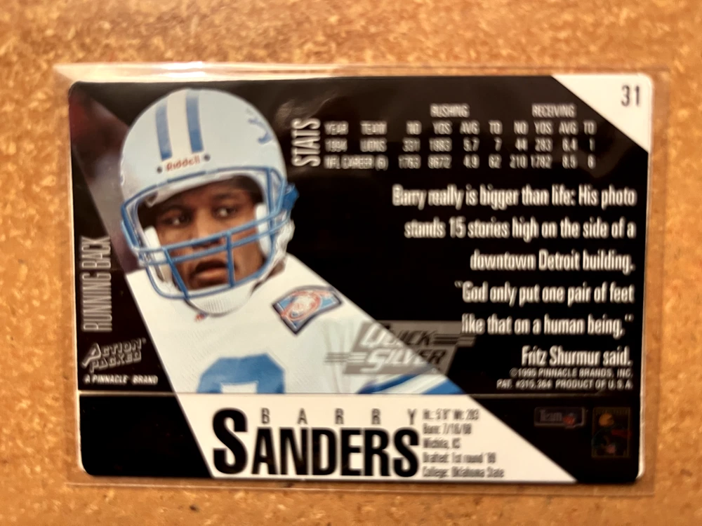 Player/Athlete:Barry SandersFeatures:Parallel/Variety, Base SetTeam:Detroit Lionsbrand:PinnacleParallel/Variety:Quick SilverSet:1995 Action PackedSeries:Action PackedSport:FootballManufacturer:PinnacleSeason:1995Card Number:31League:National Football League (NFL)