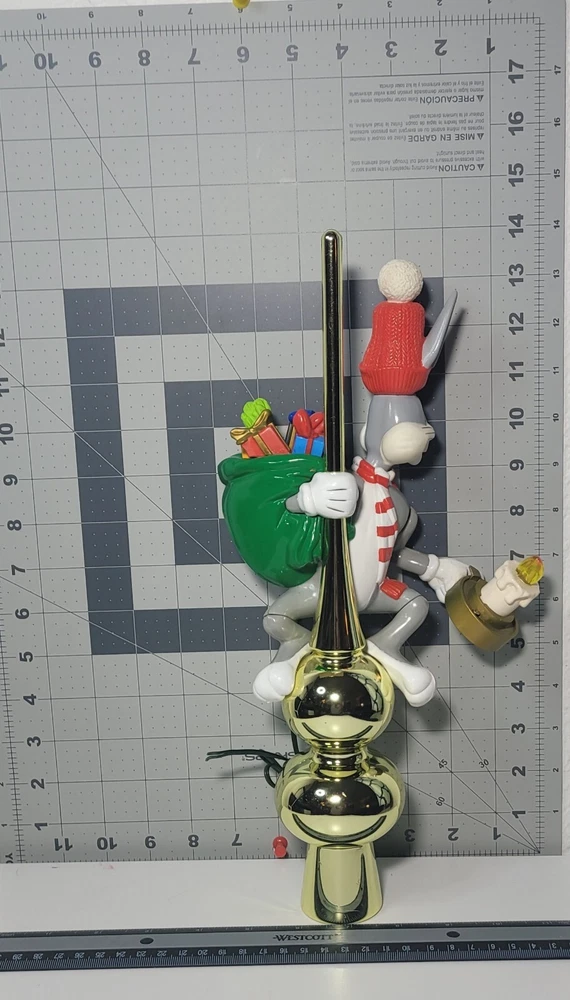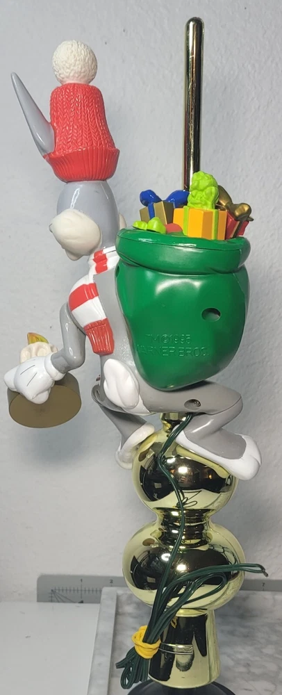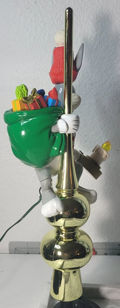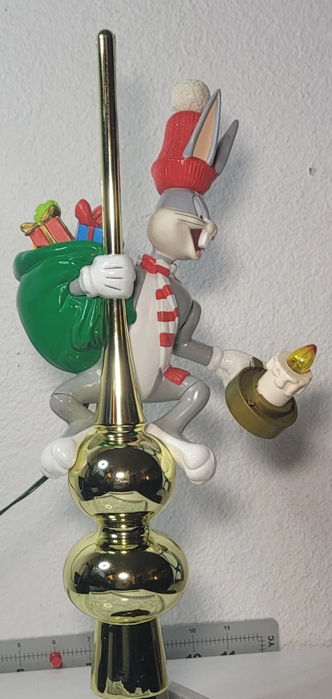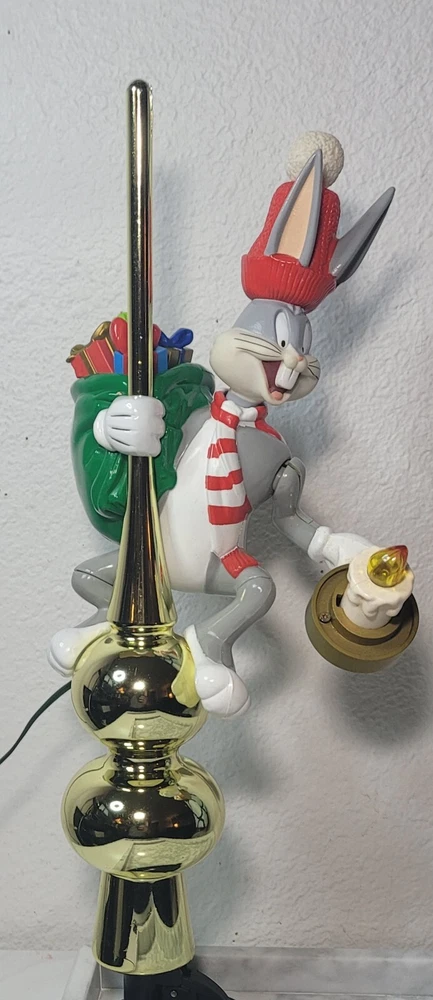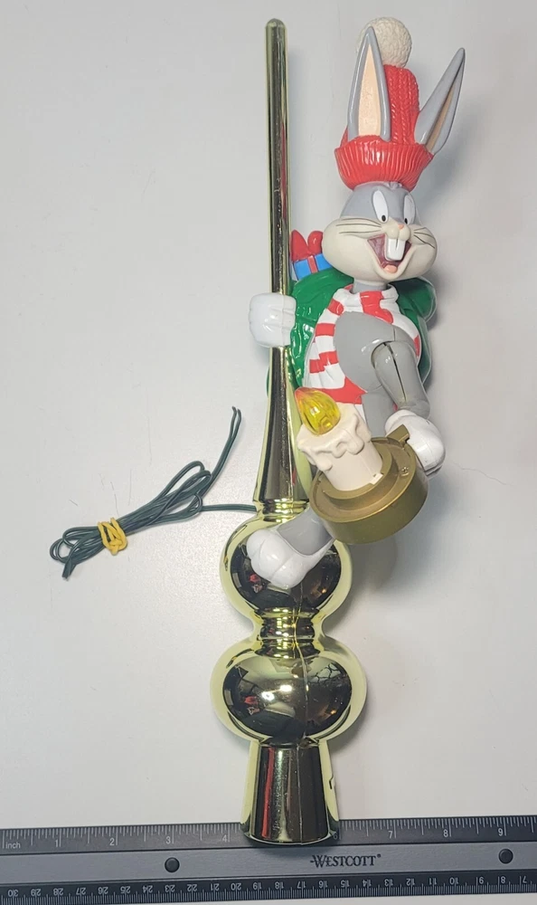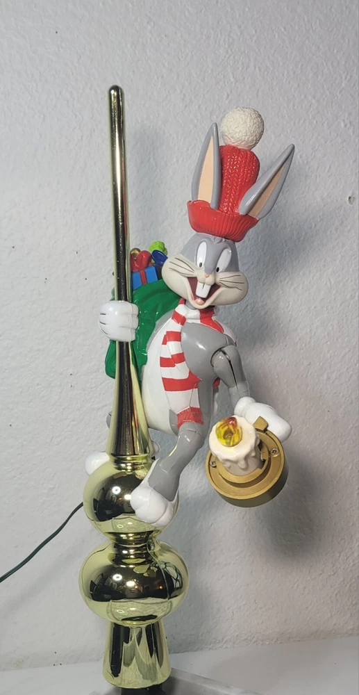 1995 Bugs Bunny Animated Christmas Tree Topper Condition: Good overall condition, with some noted issues: 1. Electrical: Unable to test due to the plug wire being cut; not an electrician and can not fix it. 2. Bugs Bunny Left Arm: The left arm appears to have an opening at the seal, but it does not seem to show significant damage and could possibly be repaired. This animated tree topper is a delightful Warner brothers collectible. Please keep in mind that the item is sold as-is due to the electrical issues. Message me today if you're interested or have any questions! NO RETURNS OM THIS ITEM.