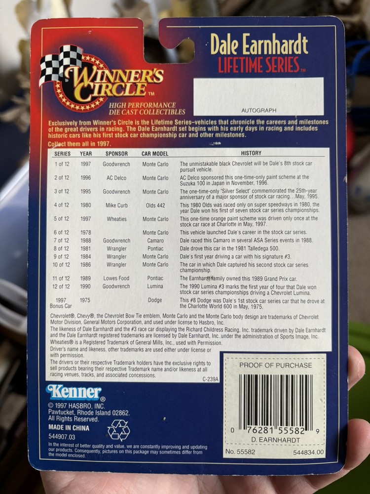 Vehicle Type: NASCAR Racecar Organization: NASCAR Color: Gray UPC: N/A Vehicle Make: Chevrolet Brand: Winner's Circle Scale: 1:64 gtin13: N/A Character Family: Goodwrench Model: Goodwrench Monte Carlo 3 Driver: Dale Earnhardt Vehicle Year: 1995 Material: Diecast Series: Lifetime Series