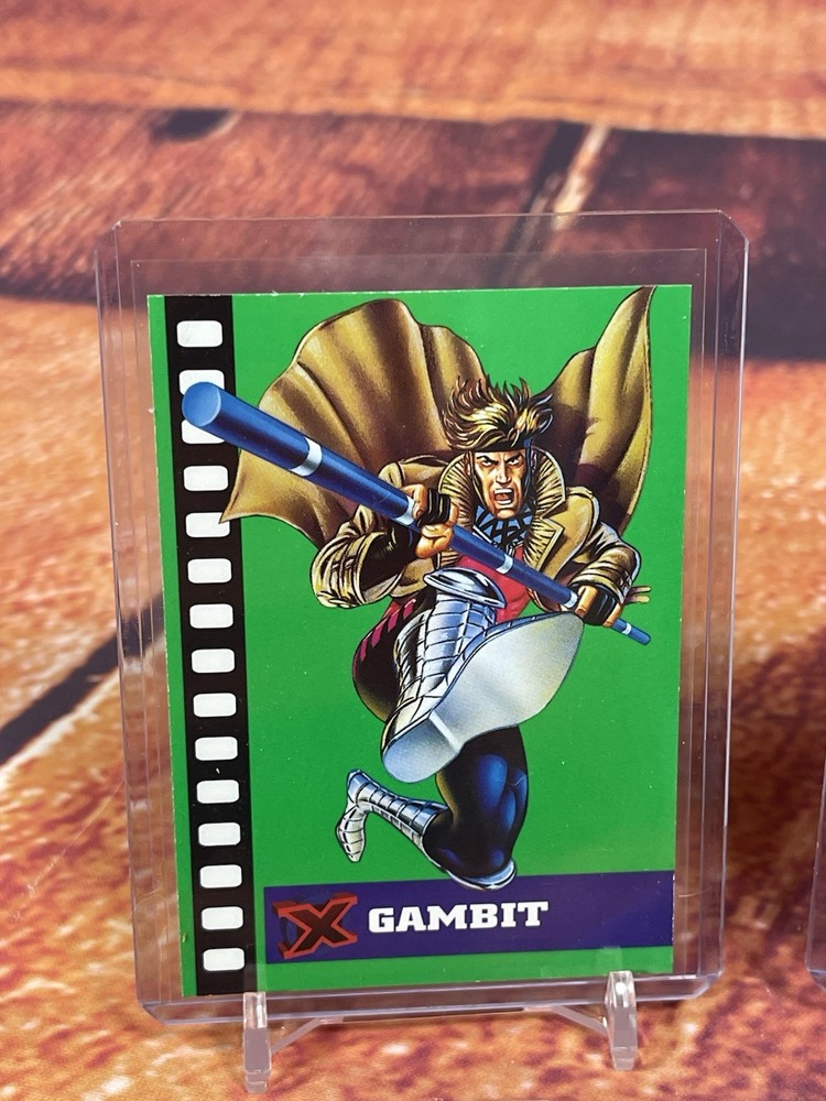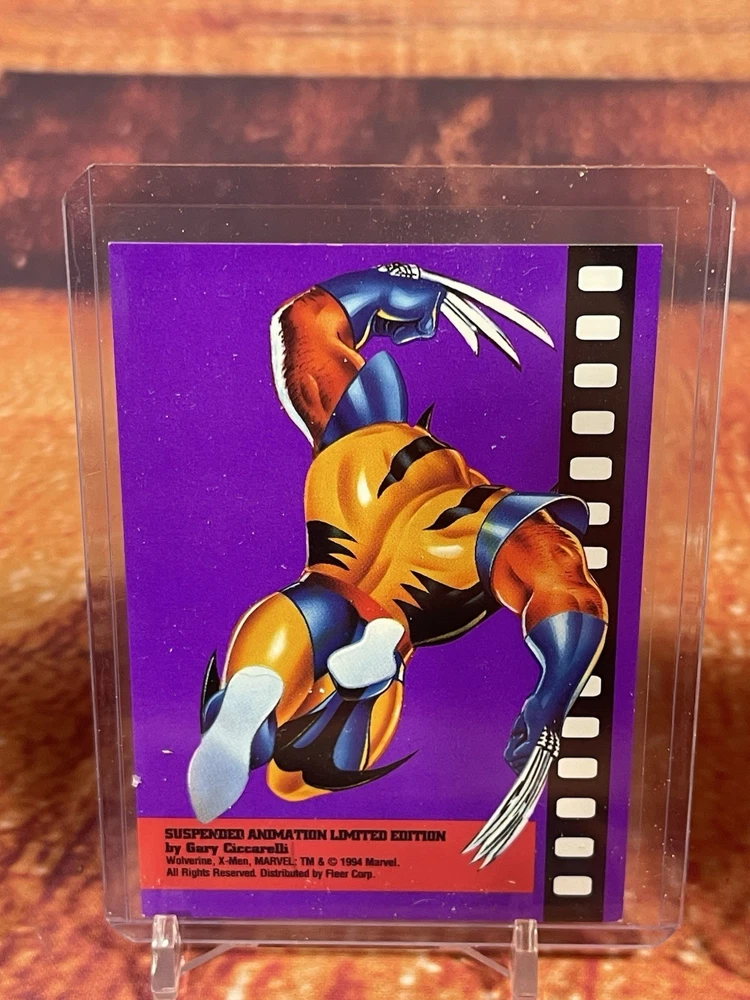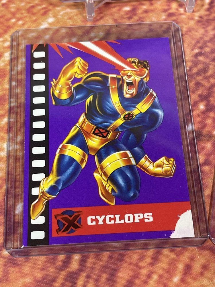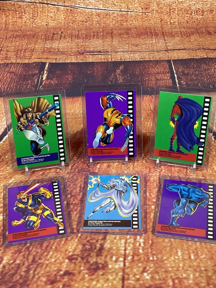 Damage on front bottom right corner of cyclops as seen in pick. Very rare to see complete set of all 6 cards! The complete 1995 Fleer Ultra X-Men Suspended Animation Toy Biz promo set consists of 6 specific cards featuring popular X-Men characters. These promo cards were inserts with solid-color backgrounds, different from the standard 10-card acetate insert set found in hobby packs. Toy Biz Promo Set Checklist The 1995 Fleer Ultra X-Men Toy Biz promo cards were included inside carded action figures from the Toy Biz X-Men Classics line and are printed on regular card stock with a 1994 copyright and a stylized "X" logo. The complete set includes the following 6 characters: Beast: Featured in the promo set. Cyclops: Available as a promo card. Gambit: Part of this specific 6-card set. Magneto: Also included in the set. Storm: A character featured in the Toy Biz promo. Wolverine: The final card, often considered the most popular and potentially valuable of the set. Distinction from Standard Insert Set