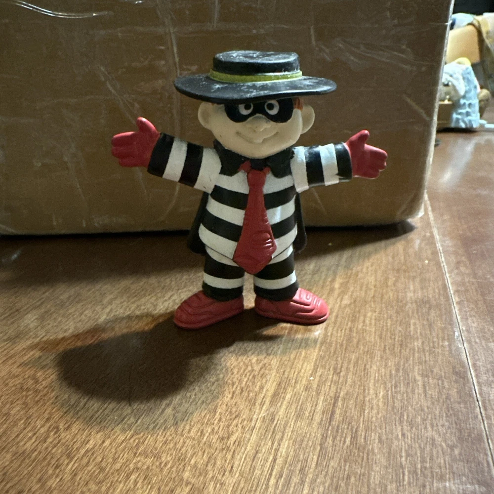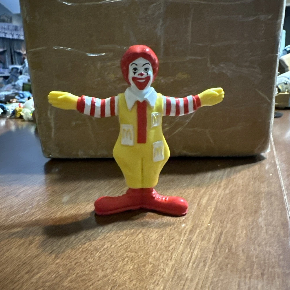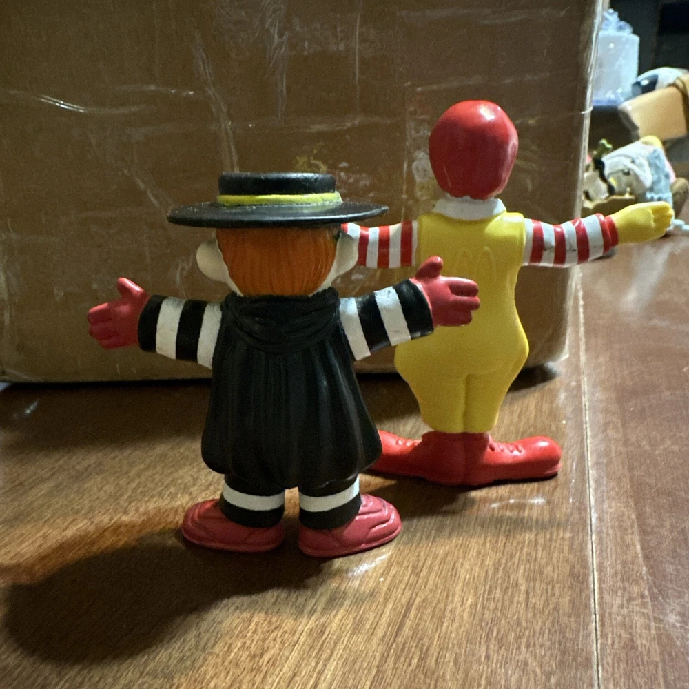 This 1995 McDonald's Happy Meal toy figurine set features the beloved characters Ronald McDonald and Hamburglar. Made of PVC material, these vinyl figures are perfect for collectors and fans of the McDonald's franchise. The set includes model year Ronald McDonald and Hamburglar, along with other fun accessories. This item is a must-have for any McDonald's or fast food culture enthusiasts.
