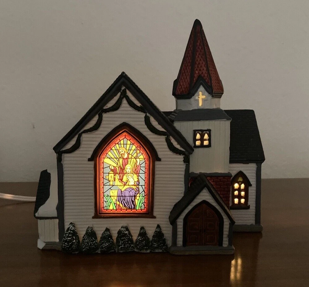 Vintage 1995 Lemax Porcelain Dickensvale Lighted House Church Village Collection 55173 small chip on bottom as can be seen in attached photos. Please see detailed pictures for the most accurate description. I try to describe items as accurately as I can. The photos play an important role in understanding the items’ overall condition. Comes from a smoke free, pet free home. Along with "recycling" items of yesteryear, I emphasize the importance of environmental safety and not abusing our Earth's natural resources. Recycled materials may be used when packing merchandise and will not compromise the integrity of safe delivery.