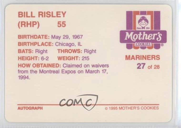 1995 Mother's Cookies Seattle Mariners - Stadium Giveaway [Base] #27 Bill Risley - Baseball Card - Featuring the Seattle Mariners - Featuring Bill Risley Search for more: 1995 Mother's Cookies Seattle Mariners Search for more: 1995 Mother's Cookies Seattle Mariners - Stadium Giveaway [Base] View all of our Listings Auctions Buy It Now About Us Located in the beautiful Pacific Northwest, COMC (Check Out My Cards) is the world's largest consignment service for trading card singles. More than 10,000 people have used our consignment service to list over 50 million trading cards. Find out how we can help you consign your items on eBay by contacting us through eBay messaging. COMC -- "The Safe & Easy Way to Buy & Sell" Representative Image - Select Specific Item above to see image of actual item Representative Image - Select Specific Item above to see image of actual item Raw Condition for Modern Cards Unless otherwise noted, raw modern cards are listed in Near Mint-Mint condition or better. A NM-MT card appears to be Mint at first glance, but upon closer inspection, may exhibit some of the following: minor print defects (e.g. roller marks, print line, dimple), minor scratches, slight edge wear, and slight corner wear. Centering is clearly visible in the images provided and does not factor into our condition assessment. Raw Condition for Vintage Cards Unless otherwise noted, raw vintage cards are listed in Excellent condition or better. An EX card may exhibit some of the following: minor rounding of corners, surface wear, print defects, light scratches, and slight edge wear/chipping. Centering is clearly visible in the images provided and does not factor into our condition assessment. Domestic Shipping Combined shipping for multiple items is available. To receive combined shipping, please ensure all desired items are in your eBay shopping cart before proceeding to checkout. eBay limits orders to 40 items per order. We automatically combine multiple orders placed on the same day. If you place multiple orders on the same day, please contact us to request a refund of applicable shipping costs. Signature confirmation may be required on invoices over $400. All cards are protected and shipped securely. International Shipping COMC offers eBay's International Shipping (EIS) for international orders under $2,500* (see country exceptions below). All duties and import fees are paid at checkout; in the rare event that there are additional import fees upon delivery, these are borne by the buyer. EIS packages route through a shipping hub in Erlanger, KY before shipping to their final destination. Please note that EIS does not allow for combined shipments. The shipping rates are determined by eBay and cannot be adjusted. *Maximum sale price exceptions: Colombia, Kuwait ($2,000); Taiwan ($1,539); Chile, Costa Rica, Guatemala, Honduras, Trinidad and Tobago ($1,000); Antigua and Barbuda, Aruba, Belize, Dominica, Grenada, Philippines, Saint Kitts and Nevis, Saint Lucia, Montserrat, Turks and Caicos Islands ($500); Dominican Republic, El Salvador ($200). Please request a shipping quote through eBay messaging for orders that exceed the maximum sale price supported by eBay's International Shipping. You will be responsible for all duties and import fees for international orders shipped outside the EIS. All cards are protected and shipped securely. Payment COMC does not accept offers on our cards through our eBay storefront. COMC utilizes eBay’s managed payments system. If you are experiencing difficulties making a payment, please contact eBay for assistance. Return Policy Returns are only accepted on the rare occasion the item is not as described. If you are making a return, please initiate the return process through eBay so a mailing label can be provided for you. Prior to listing, our expert team carefully assessed this item to represent it accurately. Please review the description and high-definition images prior to purchasing to ensure this item meets your satisfaction. We welcome you to contact us if you have further questions about this item. Trust and Integrity COMC carefully assesses each item consigned to us to prevent fraudulent items from entering the marketplace. If you believe an item offered on COMC may be fraudulent, please contact us with details so we can investigate the issue. Items we determine are outside our supported items policy may be removed. Last Modified: 2/3/2025 8:10:43 PM PDT