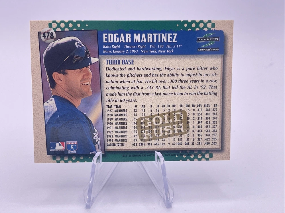 1995 Score - Gold Rush #478 Edgar Martinez is a trading card single featuring the baseball player Edgar Martinez. This card is part of the Gold Rush series by Score, known for their collectible sports trading cards. A sought-after item for fans and collectors in the Sports Mem, Cards & Fan Shop category.