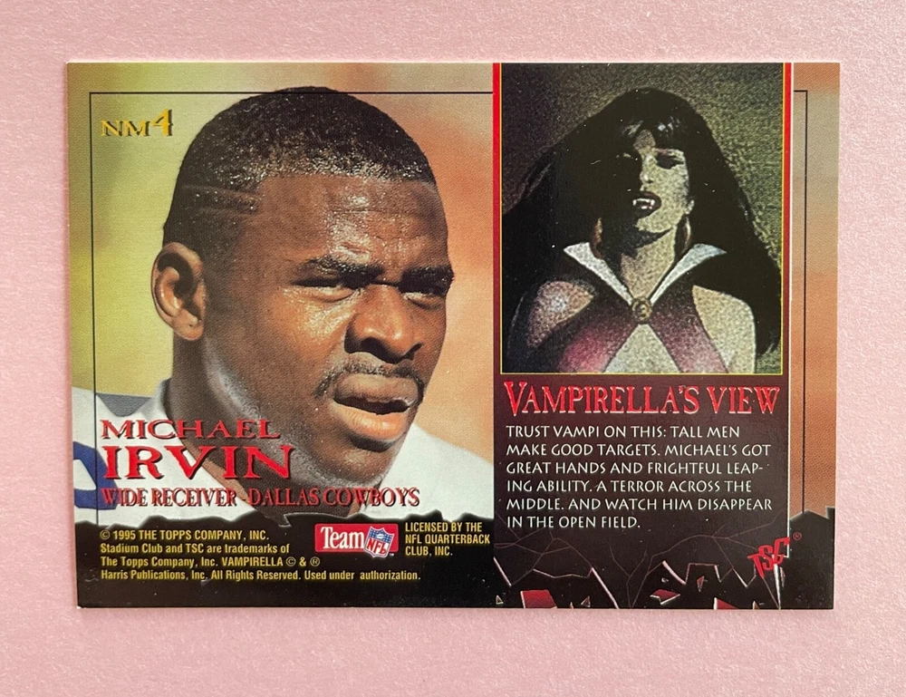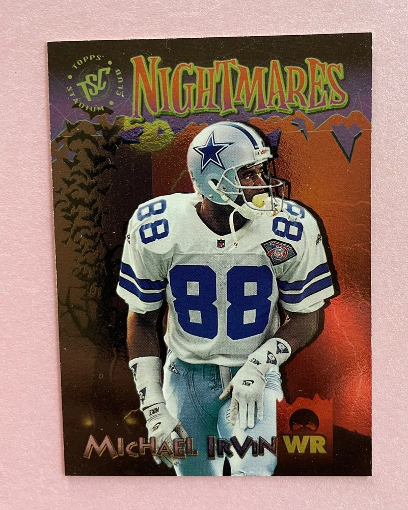 This 1995 Topps Stadium Club sports trading card features Michael Irvin, the talented player from the Dallas Cowboys team. The card is from the Nightmares insert set and has the card number NM4. It is a great addition to any football enthusiast's collection, especially those who love to trade sports trading cards. The card is from the National Football League (NFL) and manufactured by Topps. It is a must-have for fans of the sport and collectors of trading cards. This card is a unique item that features Irvin's talent and the team's success. It is a great investment for anyone who wants to add to their collection.