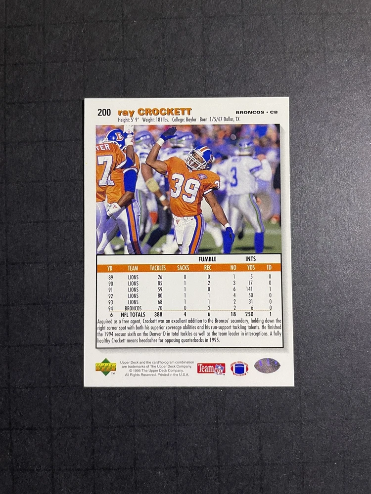 League: National Football League (NFL) Team: Miami Dolphins, Buffalo Bills, New York Jets, Denver Broncos, New England Patriots, Kansas City Chiefs, Oakland Raiders, San Diego Chargers, Indianapolis Colts, Jacksonville Jaguars, Cincinnati Bengals, Pittsburgh Steelers, Cleveland Browns, Dallas Cowboys, New York Giants, Philadelphia Eagles, Washington Commanders, Tampa Bay Buccaneers, Atlanta Falcons, Carolina Panthers, San Francisco 49ers, Seattle Seahawks, Arizona Cardinals, Los Angeles Rams, Green Bay Packers, Detroit Lions, Minnesota Vikings, Chicago Bears Country/Region of Manufacture: United States Material: Card Stock Card Number: 200 Manufacturer: Upper Deck Features: Parallel/Variety, Short Print Season: 1995 Language: English Player/Athlete: Ray Crockett Parallel/Variety: Players Club Type: Sports Trading Card Autographed: No Original/Licensed Reprint: Original Set: 1995 Upper Deck Collector's Choice Sport: Football Card Size: Standard
