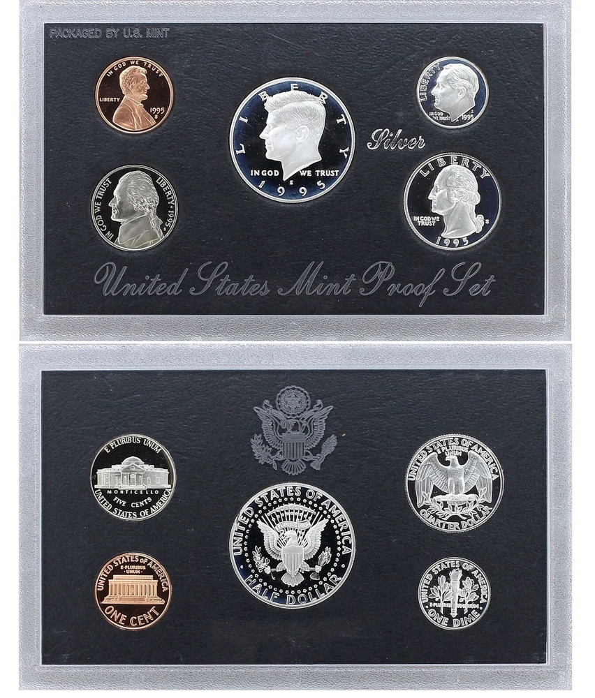 1995 United States Mint Silver Proof Set - 5 Coins - COA & OGP 90% Silver This 1995 Silver Proof Set contains 5 proof condition coins. This set contains the Lincoln Cent, Jefferson Nickel, Roosevelt Dime, Washington Quarter and Kennedy Half Dollar. The dime, quarter and half dollar are minted in 90% pure silver. This 1995 Silver Proof Set comes in like new condition, sealed in its plastic display case with a black background as packaged by the U.S. Mint, and includes the original Mint black cardboard envelope and Certificate of Authenticity.