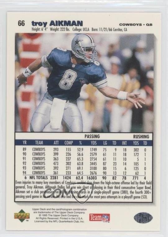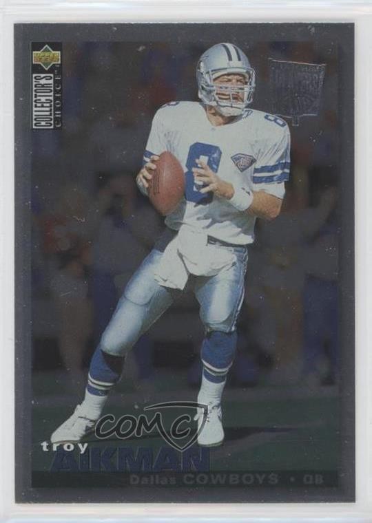 1995 Upper Deck Collector's Choice - [Base] - Platinum Players Club #66 Troy Aikman - Football Card - Featuring the Dallas Cowboys - Featuring Troy Aikman Search for more: 1995 Upper Deck Collector's Choice Search for more: 1995 Upper Deck Collector's Choice - [Base] - Platinum Players Club View all of our Listings Auctions Buy It Now About Us Located in the beautiful Pacific Northwest, COMC (Check Out My Cards) is the world's largest consignment service for trading card singles. More than 10,000 people have used our consignment service to list over 50 million trading cards. Find out how we can help you consign your items on eBay by contacting us through eBay messaging. COMC -- "The Safe & Easy Way to Buy & Sell" Representative Image - Select Specific Item above to see image of actual item Representative Image - Select Specific Item above to see image of actual item Raw Condition for Modern Cards Unless otherwise noted, raw modern cards are listed in Near Mint-Mint condition or better. A NM-MT card appears to be Mint at first glance, but upon closer inspection, may exhibit some of the following: minor print defects (e.g. roller marks, print line, dimple), minor scratches, slight edge wear, and slight corner wear. Centering is clearly visible in the images provided and does not factor into our condition assessment. Raw Condition for Vintage Cards Unless otherwise noted, raw vintage cards are listed in Excellent condition or better. An EX card may exhibit some of the following: minor rounding of corners, surface wear, print defects, light scratches, and slight edge wear/chipping. Centering is clearly visible in the images provided and does not factor into our condition assessment. Domestic Shipping Combined shipping for multiple items is available. To receive combined shipping, please ensure all desired items are in your eBay shopping cart before proceeding to checkout. eBay limits orders to 40 items per order. We automatically combine multiple orders placed on the same day. If you place multiple orders on the same day, please contact us to request a refund of applicable shipping costs. Signature confirmation may be required on invoices over $400. All cards are protected and shipped securely. International Shipping COMC offers eBay's International Shipping (EIS) for international orders under $2,500* (see country exceptions below). All duties and import fees are paid at checkout; in the rare event that there are additional import fees upon delivery, these are borne by the buyer. EIS packages route through a shipping hub in Erlanger, KY before shipping to their final destination. Please note that EIS does not allow for combined shipments. The shipping rates are determined by eBay and cannot be adjusted. *Maximum sale price exceptions: Colombia, Kuwait ($2,000); Taiwan ($1,539); Chile, Costa Rica, Guatemala, Honduras, Trinidad and Tobago ($1,000); Antigua and Barbuda, Aruba, Belize, Dominica, Grenada, Philippines, Saint Kitts and Nevis, Saint Lucia, Montserrat, Turks and Caicos Islands ($500); Dominican Republic, El Salvador ($200). Please request a shipping quote through eBay messaging for orders that exceed the maximum sale price supported by eBay's International Shipping. You will be responsible for all duties and import fees for international orders shipped outside the EIS. All cards are protected and shipped securely. Payment COMC does not accept offers on our cards through our eBay storefront. COMC utilizes eBay’s managed payments system. If you are experiencing difficulties making a payment, please contact eBay for assistance. Return Policy Returns are only accepted on the rare occasion the item is not as described. If you are making a return, please initiate the return process through eBay so a mailing label can be provided for you. Prior to listing, our expert team carefully assessed this item to represent it accurately. Please review the description and high-definition images prior to purchasing to ensure this item meets your satisfaction. We welcome you to contact us if you have further questions about this item. Trust and Integrity COMC carefully assesses each item consigned to us to prevent fraudulent items from entering the marketplace. If you believe an item offered on COMC may be fraudulent, please contact us with details so we can investigate the issue. Items we determine are outside our supported items policy may be removed. Last Modified: 7/24/2025 7:35:15 AM PDT