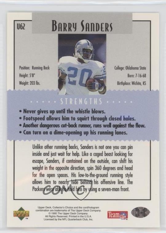 1995 Upper Deck Collector's Choice Update - [Base] - Gold #U62 Barry Sanders - Football Card - Featuring the Detroit Lions - Featuring Barry Sanders Search for more: 1995 Upper Deck Collector's Choice Update Search for more: 1995 Upper Deck Collector's Choice Update - [Base] - Gold View all of our Listings Auctions Buy It Now About Us Located in the beautiful Pacific Northwest, COMC (Check Out My Cards) is the world's largest consignment service for trading card singles. More than 10,000 people have used our consignment service to list over 50 million trading cards. Find out how we can help you consign your items on eBay by contacting us through eBay messaging. COMC -- "The Safe & Easy Way to Buy & Sell" Representative Image - Select Specific Item above to see image of actual item Representative Image - Select Specific Item above to see image of actual item Raw Condition for Modern Cards Unless otherwise noted, raw modern cards are listed in Near Mint-Mint condition or better. A NM-MT card appears to be Mint at first glance, but upon closer inspection, may exhibit some of the following: minor print defects (e.g. roller marks, print line, dimple), minor scratches, slight edge wear, and slight corner wear. Centering is clearly visible in the images provided and does not factor into our condition assessment. Raw Condition for Vintage Cards Unless otherwise noted, raw vintage cards are listed in Excellent condition or better. An EX card may exhibit some of the following: minor rounding of corners, surface wear, print defects, light scratches, and slight edge wear/chipping. Centering is clearly visible in the images provided and does not factor into our condition assessment. Domestic Shipping Combined shipping for multiple items is available. To receive combined shipping, please ensure all desired items are in your eBay shopping cart before proceeding to checkout. eBay limits orders to 40 items per order. We automatically combine multiple orders placed on the same day. If you place multiple orders on the same day, please contact us to request a refund of applicable shipping costs. Signature confirmation may be required on invoices over $400. All cards are protected and shipped securely. International Shipping COMC offers eBay's International Shipping (EIS) for international orders under $2,500* (see country exceptions below). All duties and import fees are paid at checkout; in the rare event that there are additional import fees upon delivery, these are borne by the buyer. EIS packages route through a shipping hub in Erlanger, KY before shipping to their final destination. Please note that EIS does not allow for combined shipments. The shipping rates are determined by eBay and cannot be adjusted. *Maximum sale price exceptions: Colombia, Kuwait ($2,000); Taiwan ($1,539); Chile, Costa Rica, Guatemala, Honduras, Trinidad and Tobago ($1,000); Antigua and Barbuda, Aruba, Belize, Dominica, Grenada, Philippines, Saint Kitts and Nevis, Saint Lucia, Montserrat, Turks and Caicos Islands ($500); Dominican Republic, El Salvador ($200). Please request a shipping quote through eBay messaging for orders that exceed the maximum sale price supported by eBay's International Shipping. You will be responsible for all duties and import fees for international orders shipped outside the EIS. All cards are protected and shipped securely. Payment COMC does not accept offers on our cards through our eBay storefront. COMC utilizes eBay’s managed payments system. If you are experiencing difficulties making a payment, please contact eBay for assistance. Return Policy Returns are only accepted on the rare occasion the item is not as described. If you are making a return, please initiate the return process through eBay so a mailing label can be provided for you. Prior to listing, our expert team carefully assessed this item to represent it accurately. Please review the description and high-definition images prior to purchasing to ensure this item meets your satisfaction. We welcome you to contact us if you have further questions about this item. Trust and Integrity COMC carefully assesses each item consigned to us to prevent fraudulent items from entering the marketplace. If you believe an item offered on COMC may be fraudulent, please contact us with details so we can investigate the issue. Items we determine are outside our supported items policy may be removed. Last Modified: 7/23/2025 9:31:25 AM PDT