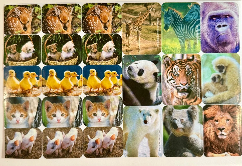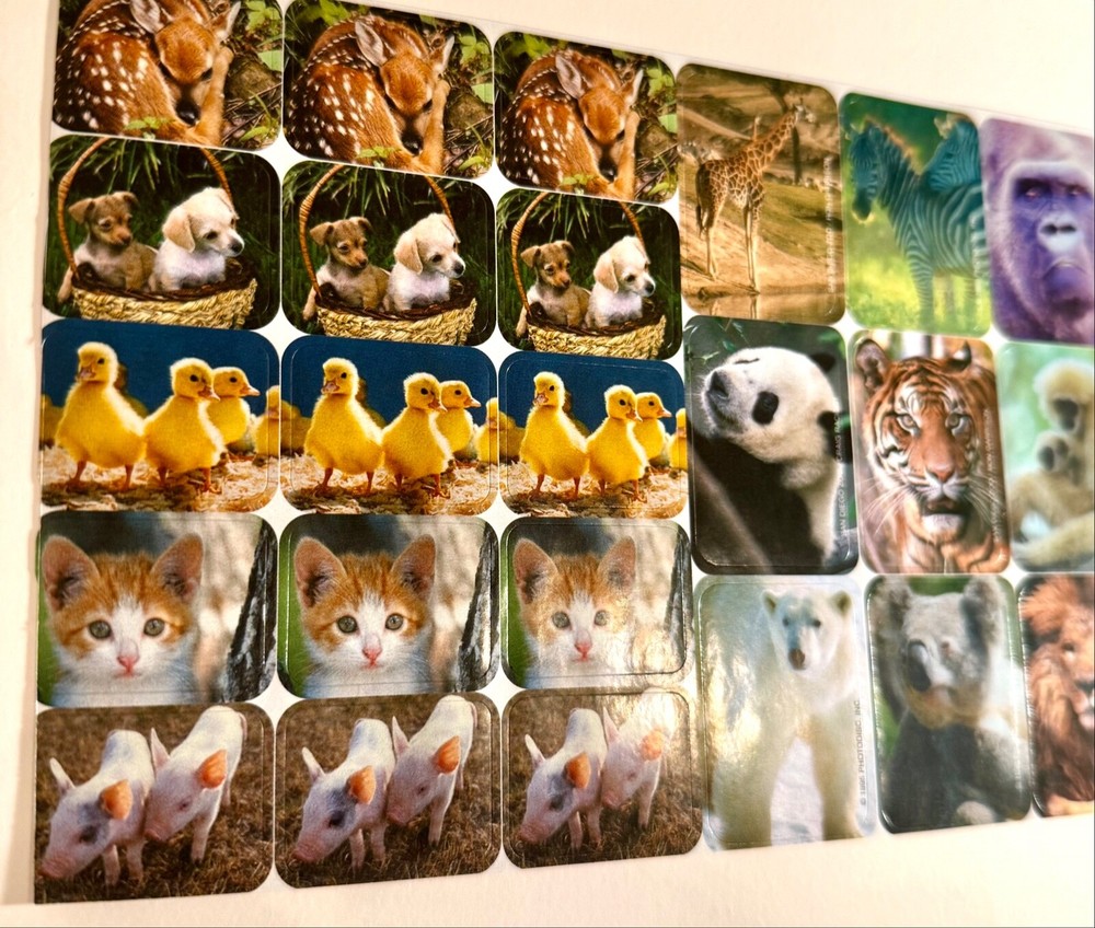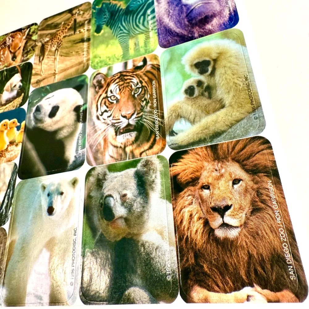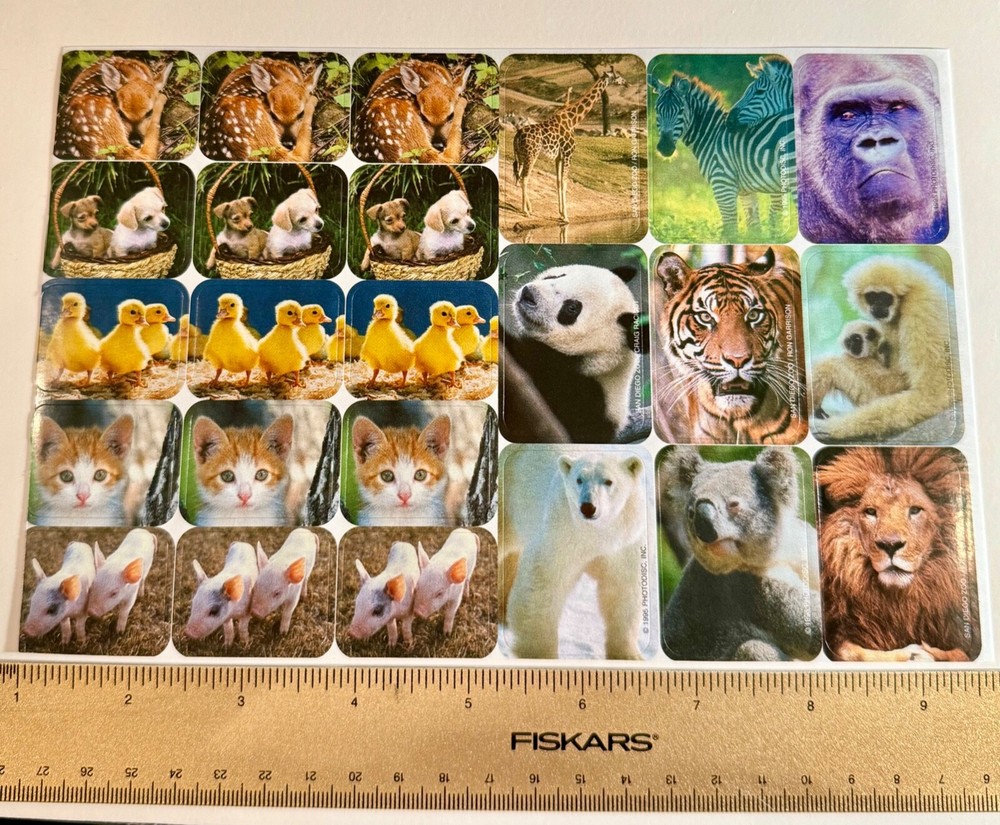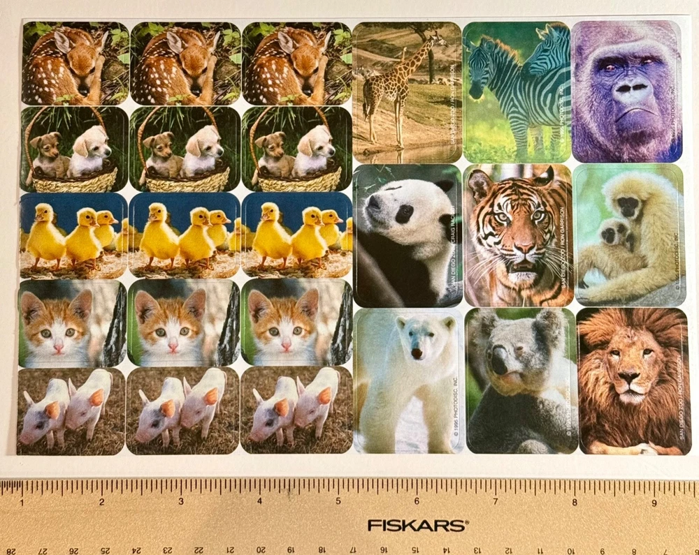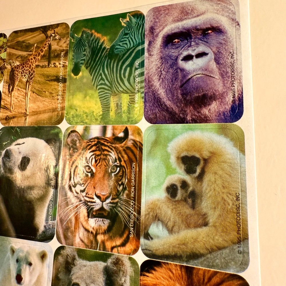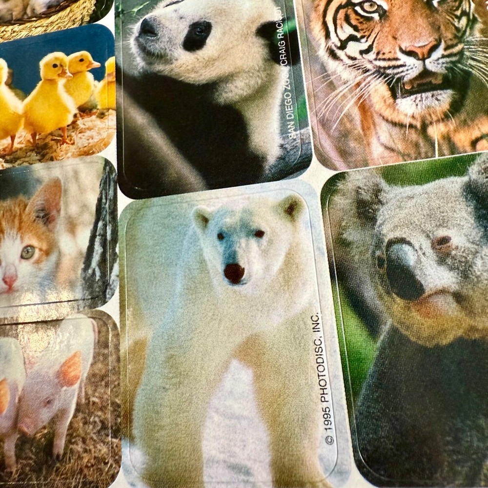 Discover a delightful 1995 collection of vintage stickers featuring a charming array of animals, from the playful kitten and piglet to the aquatic duckling and pup, all the way to the majestic polar bear and lion. Each sticker is a colorful representation of nature's diverse ecosystem, perfect for enhancing scrapbooks, journals, or personal items with a touch of nostalgia and learning. QTY. 29 STICKERS