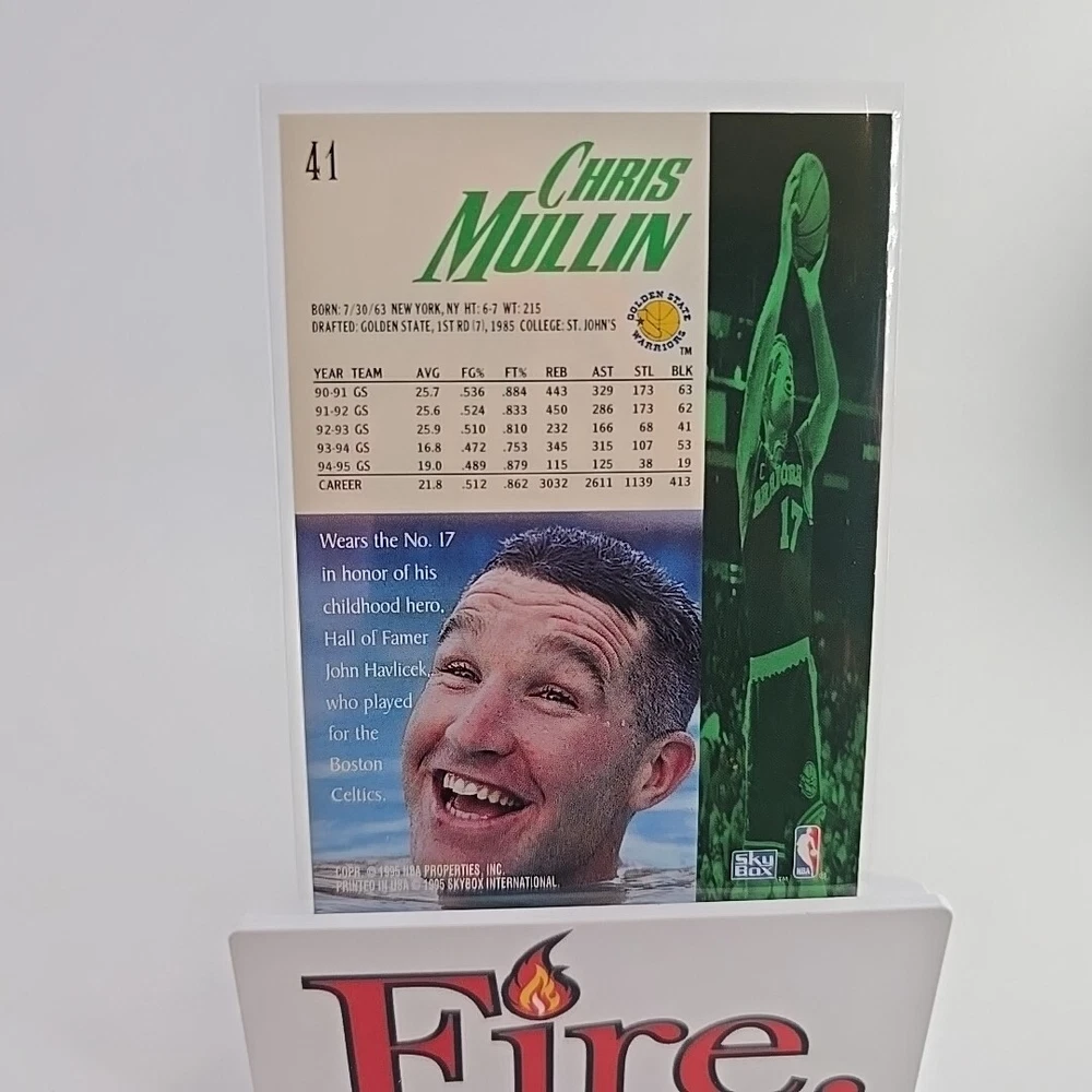 This sports trading card features Chris Mullin of the Golden State Warriors, card number 41 from the 1995-96 Skybox Premium set. It is an original, licensed print and part of the base set. The card is standard size and produced by SkyBox. The card is perfect for collectors of National Basketball Association (NBA) memorabilia and fans of Chris Mullin. It is a great addition to any sports trading card collection and would make a fantastic gift. Get your hands on this rare piece of basketball history today! Thank you for your interest, don't let it get away bid today!