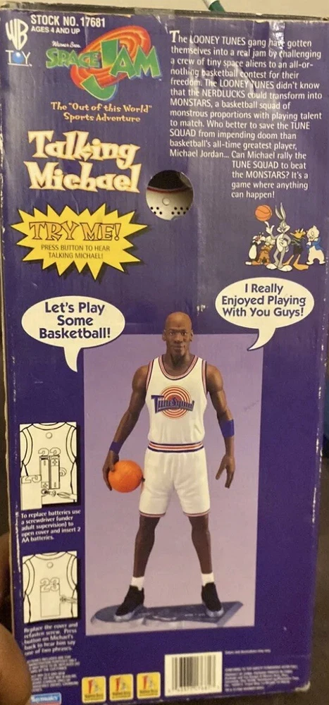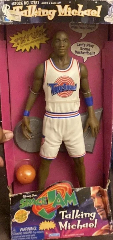 For sale is a 1996 15" Talking Michael Jordan Figure Doll by Playmate Toys. This highly sought-after collectible is brand new in its original box and features the legendary basketball player in his iconic Space Jam outfit. With its high-quality construction and attention to detail, this figure is a must-have for any fan of Michael Jordan or animation merchandise. Made in Jordan, it is a unique addition to any collection and is sure to impress.