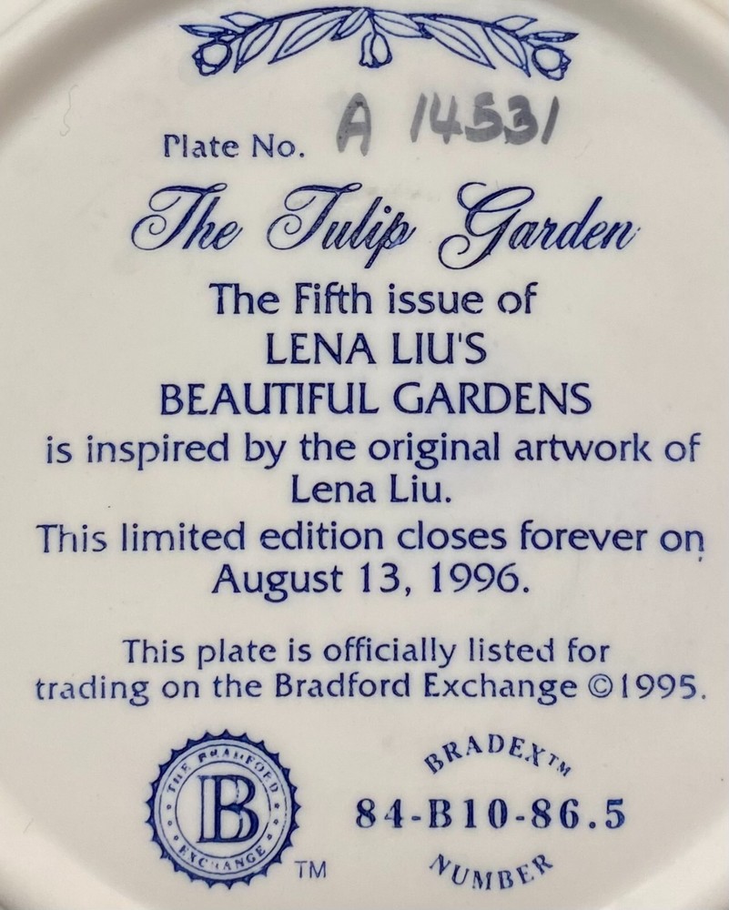 1996 "The Tulip Garden" Vintage Limited Edition 3D Plate - Bradford Exchange P late #: A14531 Art by Lena Liu " Beautiful Gardens " Series NOT TO BE USED FOR FOOD. DECORATION PURPOSES ONLY. [Q-DC1]