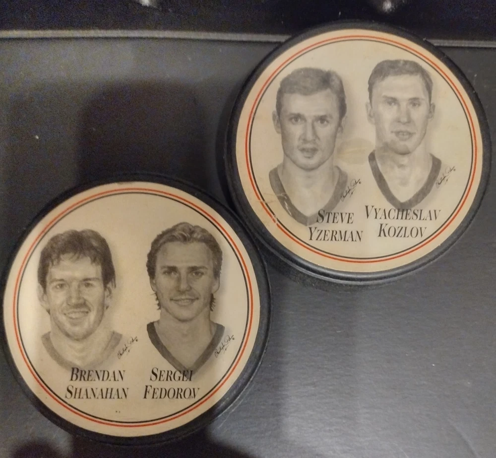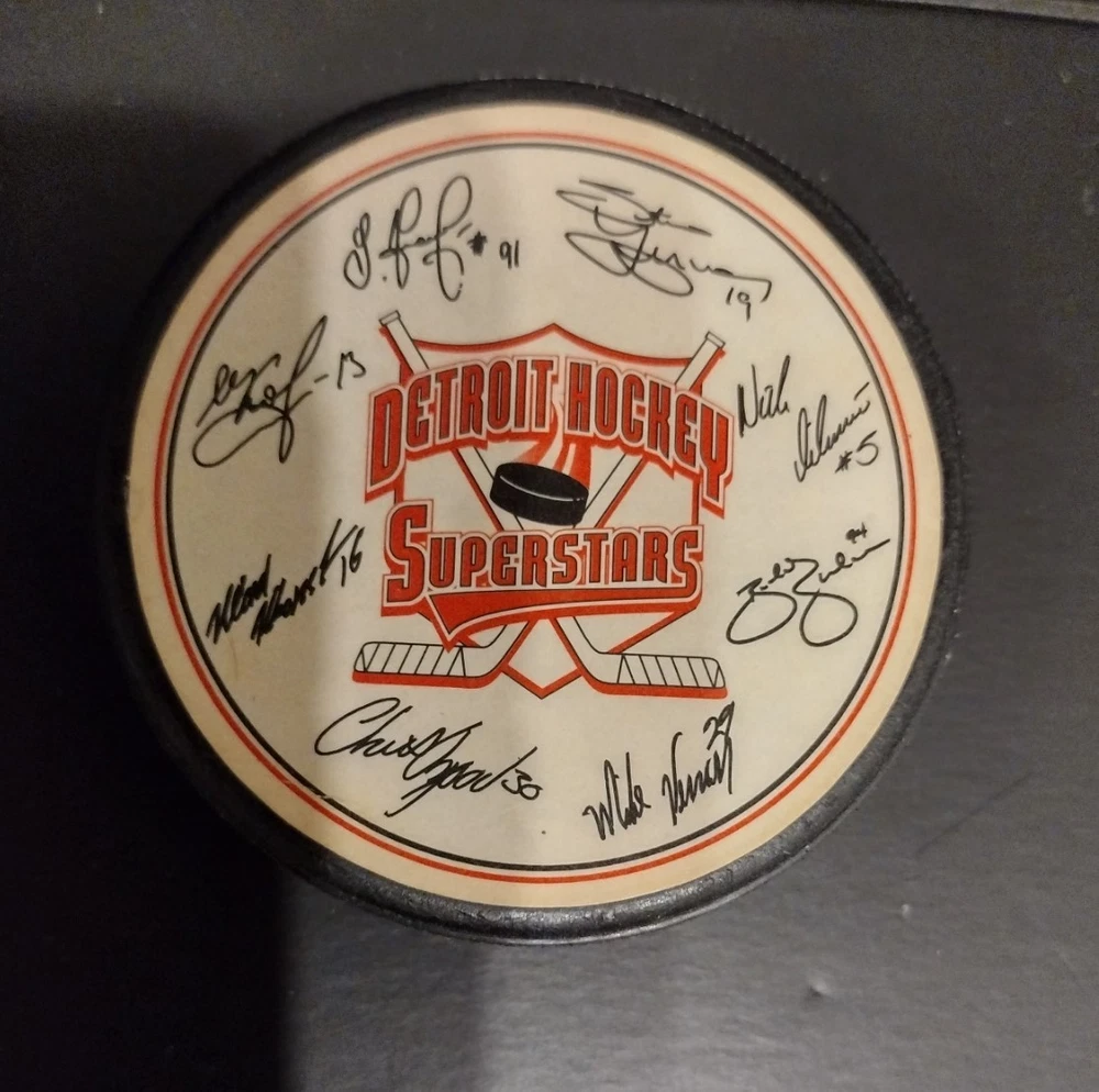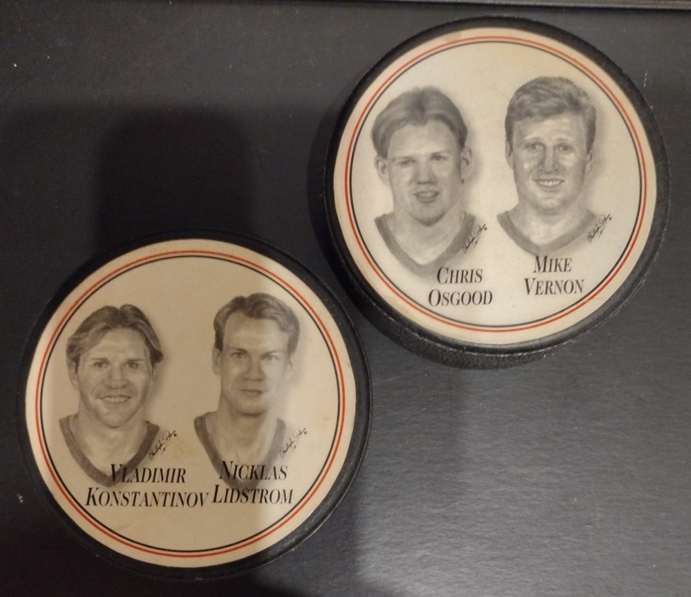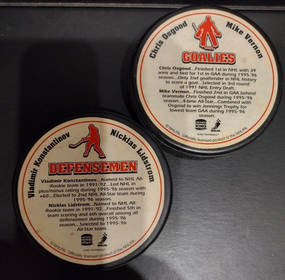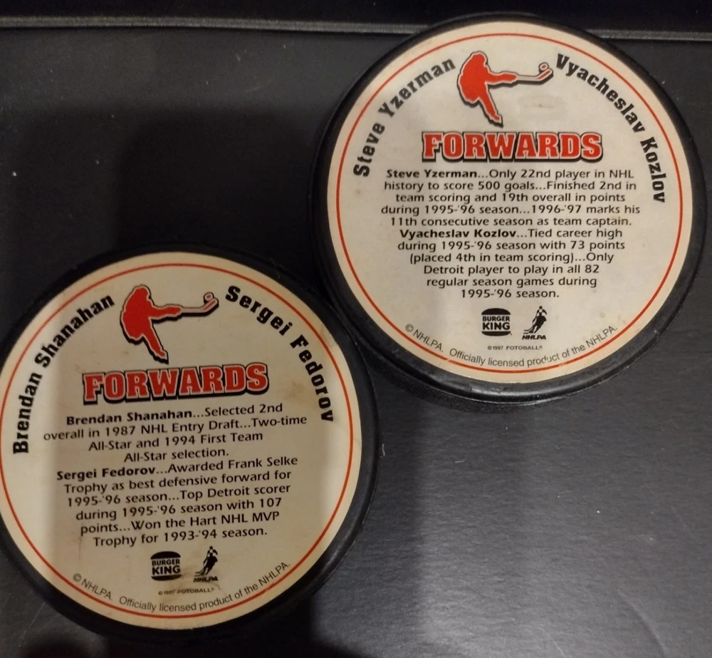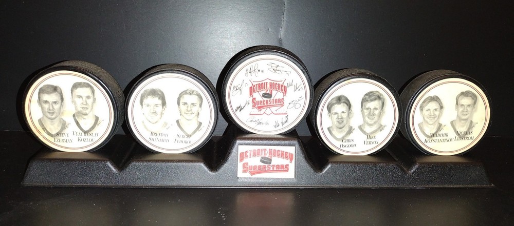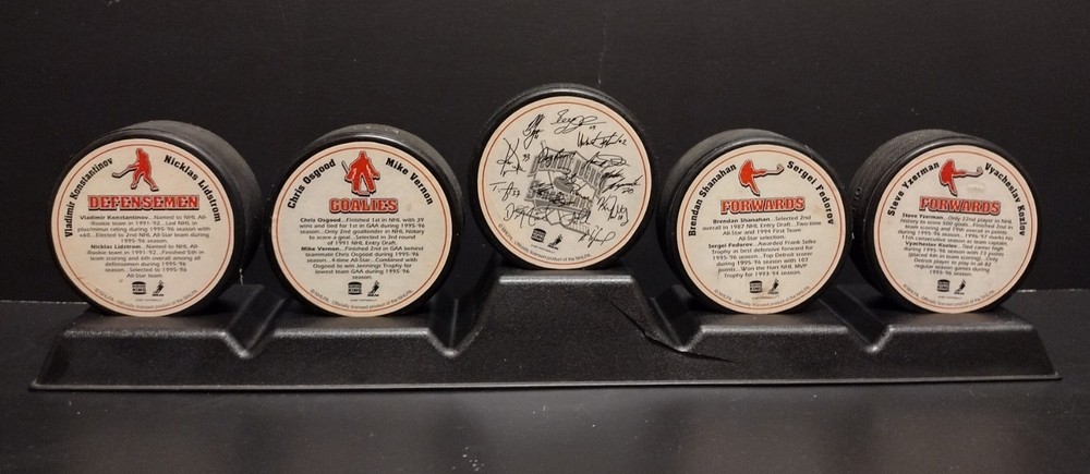 Detroit Red Wings Superstars 1995/96 Superstars 5 Puck Set with Display Stand issued thru Burger King in 1997 A very cool piece of Red Wings Memorabilia Pucks feature: Team Signatures, Konstantinov/Lidstrom, Osgood/Vernon, Shanahan/Fedorov, Yzerman/Kozlov Display rack/stand is 15" long The Rack has a small crack in it but is not noticeable or an issue. The Pucks all show some yellowing on the stickers, but no damage or tears etc. I currently have some other Red Wings Memorabilia up for sale, check out those listings too please. Shipping via USPS ground advantage or priority mail...your choice as needed International shipping at additional buyers cost Combined shipping is always available on my listings, just request or wait for modified invoice prior to paying Sold as is/pictured/described. No Returns on this item, All sales final